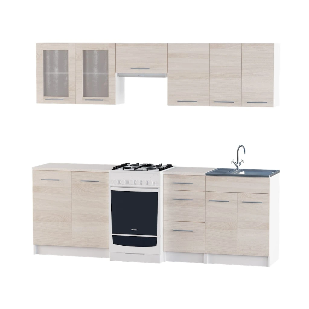 Відкрийте для себе нові можливості з модульною кухнею Еверест Еко! Цей елегантний набір, виконаний у світлому ясеню шимо та білому кольорі, чудово впишеться в будь-який інтер'єр, надаючи вашій кухні сучасного вигляду. Його продумана структура та оптимальні розміри в 2,3 метри дозволяють максимально ефективно використовувати простір, забезпечуючи комфорт та зручність під час приготування їжі.