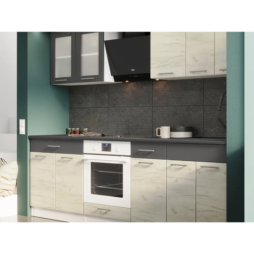 Завдовжки 2.4 метри, кухня Еверест Еко забезпечує достатньо місця для зберігання всіх необхідних речей, а також комфортного приготування їжі. Стільниця Скай додає елегантності та стійкості до механічних пошкоджень, що робить її ідеальним вибором для щоденного використання. Кожен елемент розроблений з урахуванням сучасних тенденцій, що робить цю кухню не лише красивою, а й практичною.