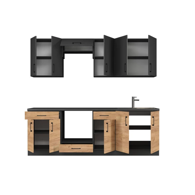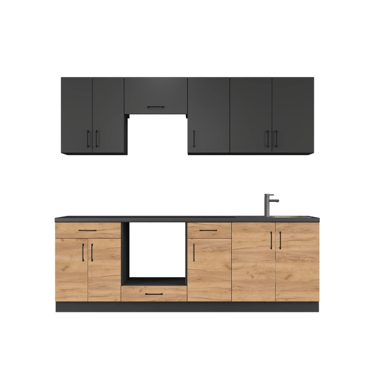 Відкрийте для себе елегантність та практичність з модульною кухнею Еверест Оптіма набору №7. Цей стильний комплект поєднує в собі антрацитове покриття та дуб крафт золотий, створюючи сучасний вигляд, що підходить для будь-якого інтер'єру. Завдяки продуманому дизайну та оптимальному розміщенню модулів, ви зможете ефективно використовувати простір вашої кухні, насолоджуючись комфортом та зручністю під час приготування їжі.