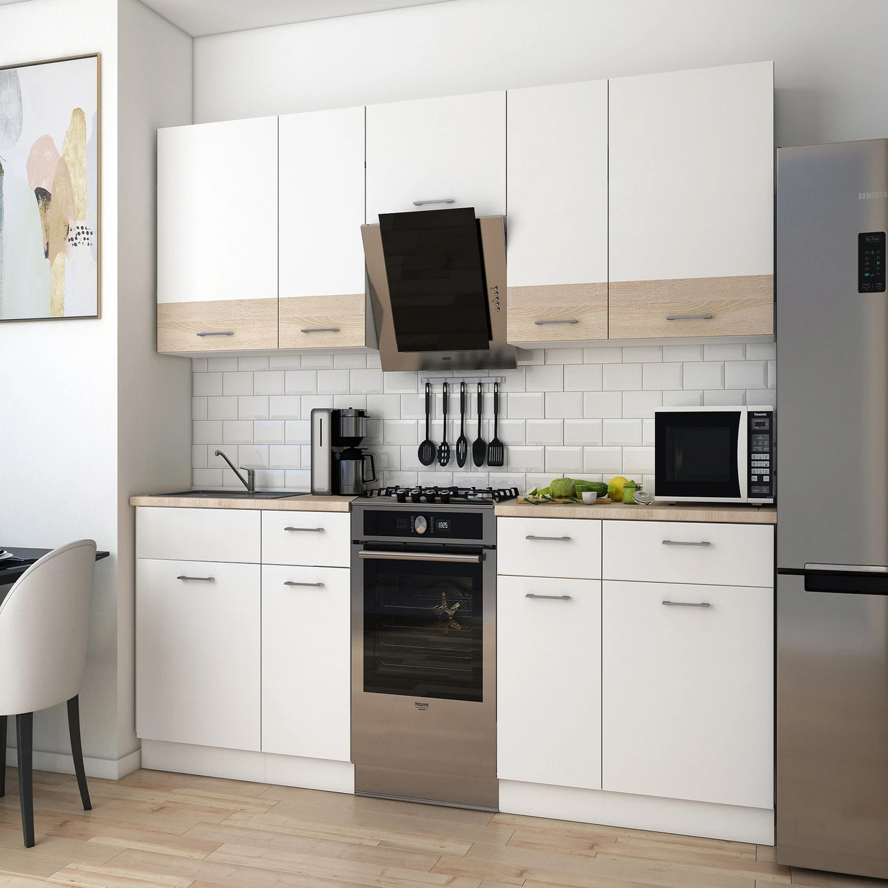 Відкрийте для себе ідеальне поєднання стильного дизайну та практичності з модульною кухнею Лея Doros. Її елегантний білий колір в комбінації з дубом сонома створює затишну атмосферу, яка доповнить будь-який інтер'єр. Простора конструкція 260х60х250 см забезпечує достатньо місця для зберігання всіх ваших кухонних приладів та продуктів, а модульна система дозволяє легко адаптувати кухню під ваші потреби.
