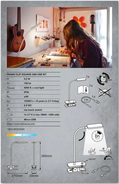 Сенсорна настільна лампа LEDVANCE з регулюванням яскравості в сучасному дизайні. Привабливий та функціональний дизайн. Завдяки роботі від акумулятора лампу можна легко переставити, а гнучка шийка лампи покращує орієнтацію джерела світла. Затискний механізм служить для зручного кріплення лампи до різних типів меблів.
