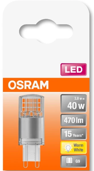 Лампа світлодіодна OSRAM LEDPIN40 3,8W/827 230V CL G9 10X1. Гарне всестороннє випромінювання. Тривалий термін служби до 15 000 год. Області застосування: створює настрій спрямоване освітлення для дому; магазини, готелі і ресторани; зовнішнє застосування тільки у відповідних світильниках. LED-альтернатива традиційним лампам розжарювання. Хороша якість світла; індекс передачі кольору Ra: ≥ 80; постійна хроматичність.
