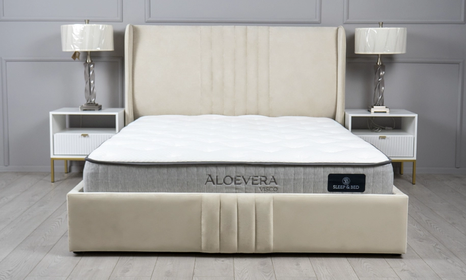 Ліжко 1,8 Лагуна молочна з підйомним механізмом — це високе двоспальне ліжко з лаконічним дизайном та м’якою оббивкою з велюру.