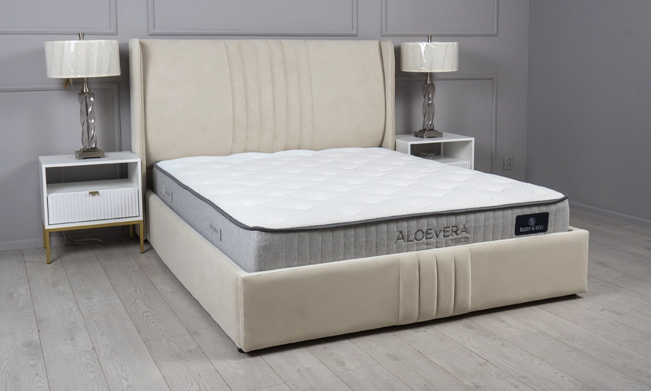 - Узголів’я з вертикальними прострочками формує акуратний силует і забезпечує комфортну опору для спини.
