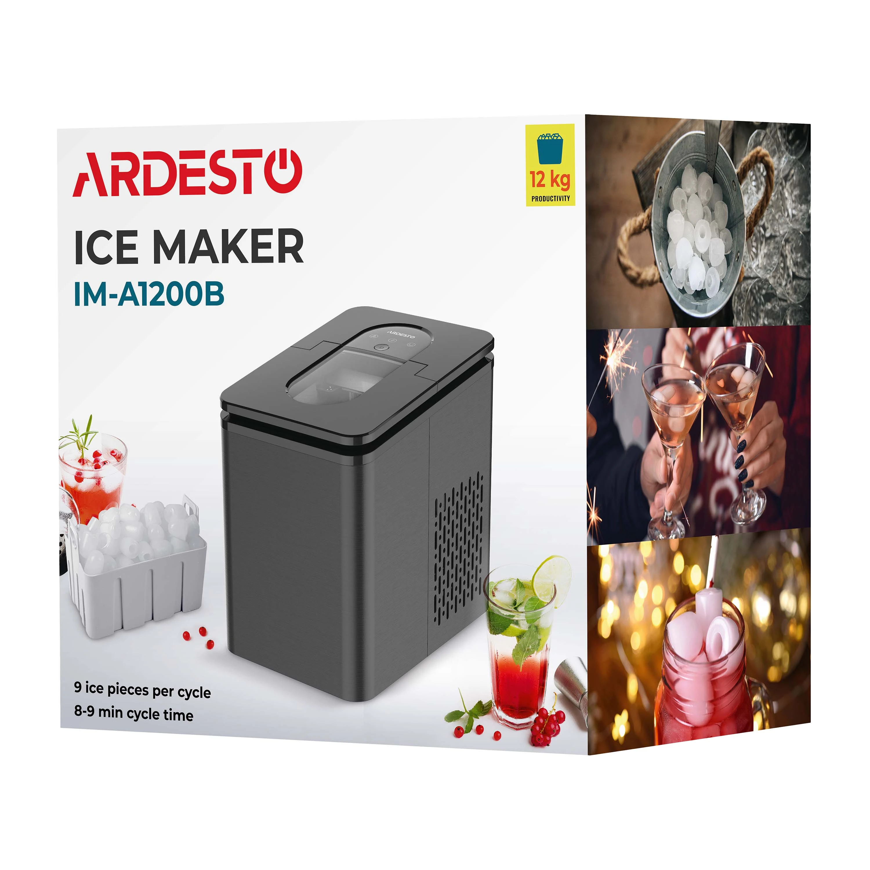 Портативний побутовий льодогенератор для швидкого приготування харчового льоду. Пристрій виконаний у стильному і практичному корпусі чорного кольору, оснащений сенсорною панеллю керування, індикаторами роботи та віконцем для візуального контролю кількості льоду. Клас захисту – І. Максимальна продуктивність ARDESTO IM-A1200B – 12 кг льоду на добу. Контейнер для льоду – 0,6 кг, цикл приготування льоду триває близько 9 хв. Об’єм резервуара – 1,8 л.
