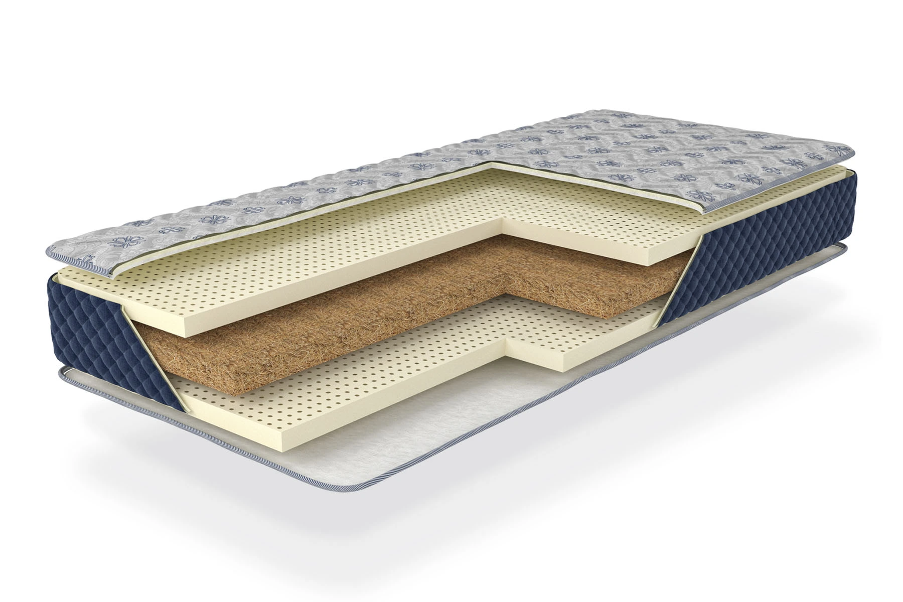 Його основа – шари латексованої кокосової койри, що відповідають за жорсткість, довгий строк служби і вентиляцію. Верхній шар із якісного натурального латексу додає м’якості, забезпечуючи легкий ефект занурення. Це дозволяє матрацу ідеально підлаштовуватися під форму тіла, даруючи відчуття невагомості та релаксації.