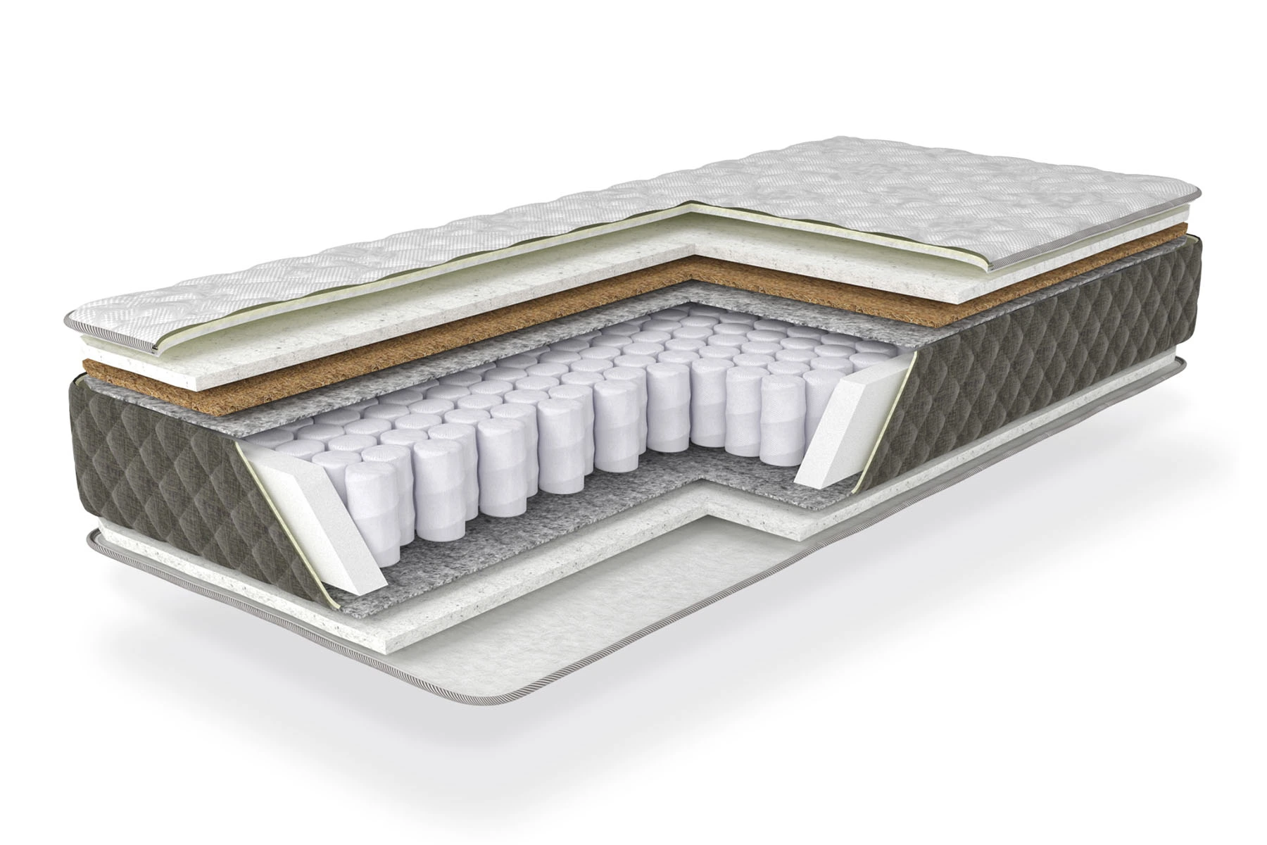 Настилочні шари матраца складаються з сучасних якісних матеріалів, які забезпечують оптимальний рівень жорсткості та комфорту. Наповнювач, що надає певних ортопедичних характеристик - шар кокосової койри, відомої своїми антибактеріальними властивостями, надає матрацу необхідну жорсткість та міцність. Натуральна термоповсть захищає м'які шари від тиску пружин, продовжуючи термін служби матраца.