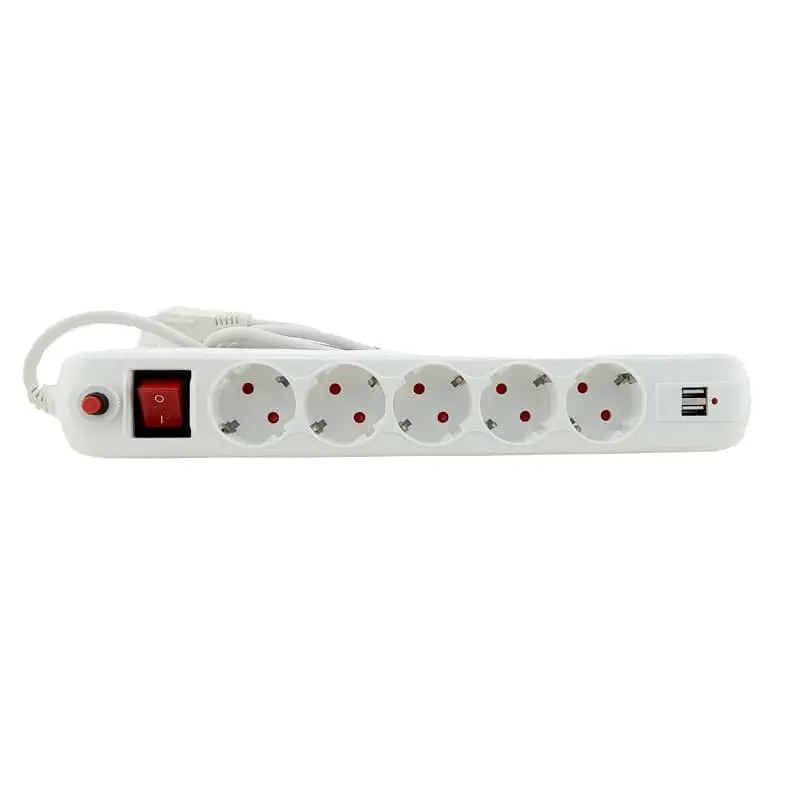 Сетевой фильтр с заземлением, кнопкой перегрузки и выключателем, 5 розеток + 2USB, 3 м, белый
