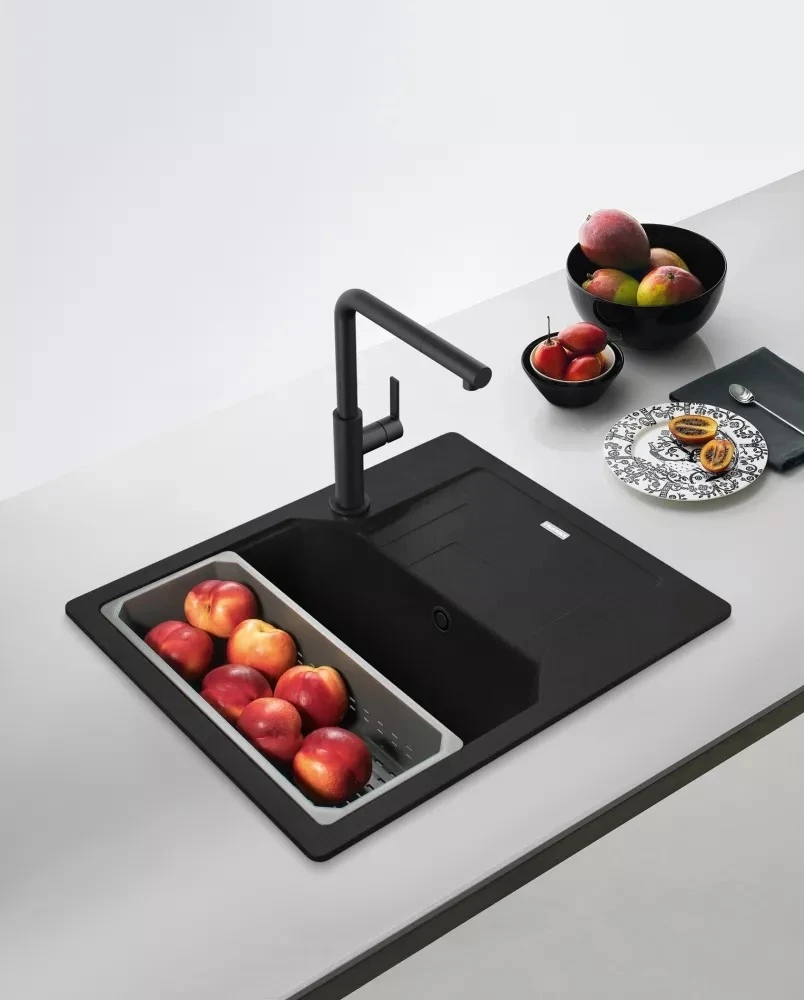 Franke Urban UBG 611-62 — стильна врізна кухонна мийка з фраграніту з крилом, розмірами 620х500 мм та глибиною чаші 220 мм. Оборотна конструкція дозволяє вибрати бік розташування крила. Колір: онікс.