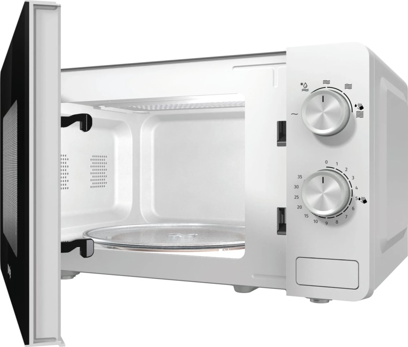 Мікрохвильова піч Gorenje MO20E1W має об’єм 20 л і потужність 800 Вт. Оснащена механічним управлінням з поворотними ручками, 5 рівнями потужності та таймером до 35 хв. Має функції розморожування, комбінованого нагріву та очищення AquaClean. Внутрішня поверхня – емаль, тарілка діаметром 27 см.