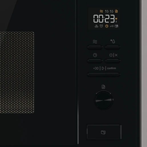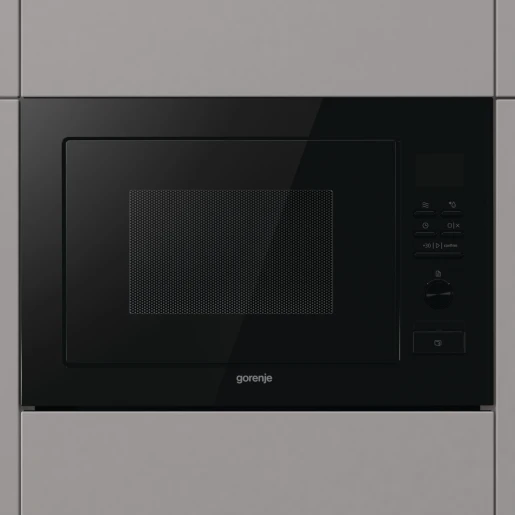Gorenje BM251M2BG — вбудована мікрохвильова піч об’ємом 25 л з потужністю мікрохвиль 900 Вт, грилем та 8 автоматичними програмами. Електронне управління з дисплеєм, 5 рівнів потужності, функція розморожування за вагою/часом, система «капля-стоп». Внутрішня камера з нержавіючої сталі, поворотна тарілка 315 мм, блокування від дітей. Підходить для щоденного використання в кухнях з обмеженим простором. Колір — чорний, сучасний дизайн з імітацією скла на панелі.