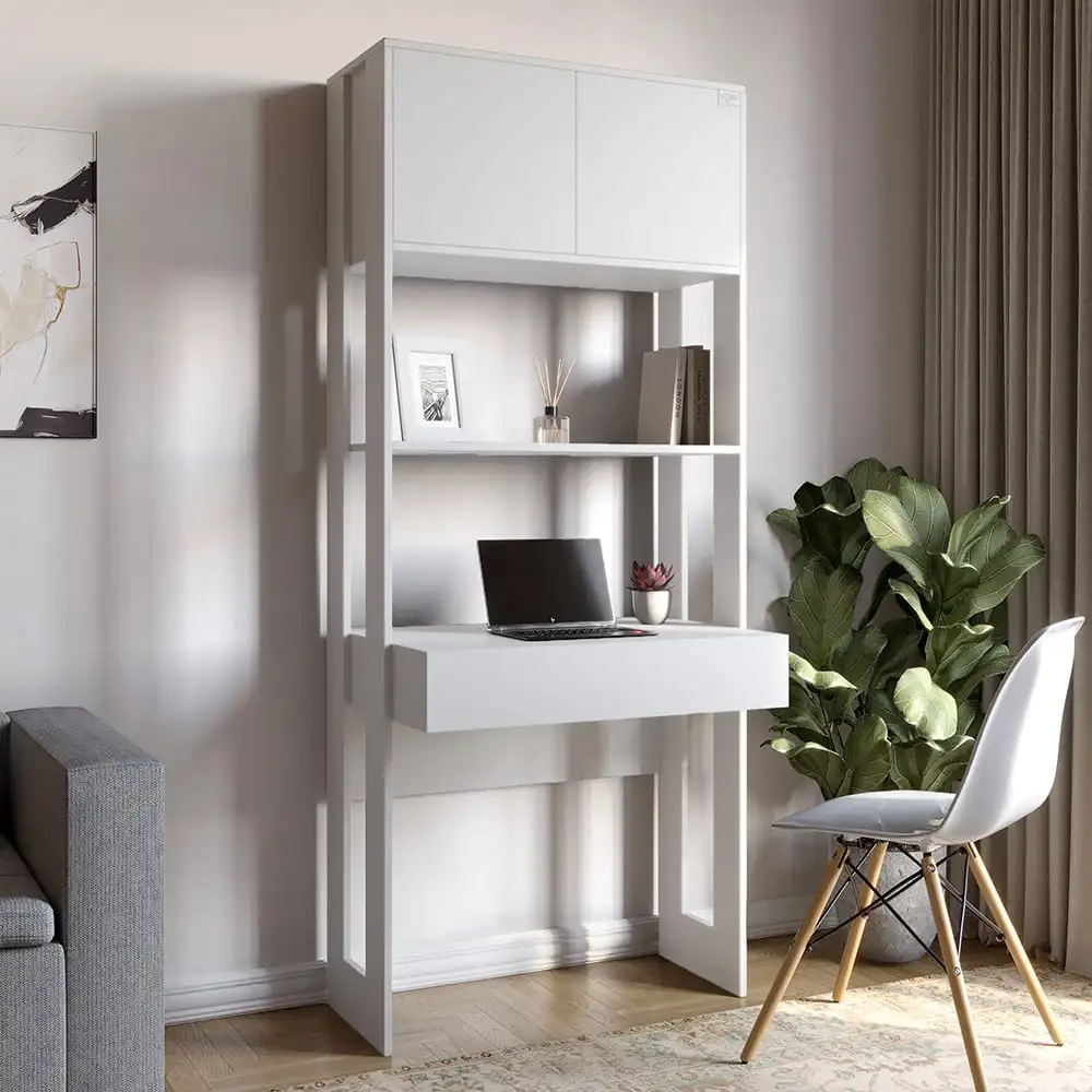 Модуль-2 стеллаж со столом и полками LION Нобу Нимфея Альба (LION-042448) ТОПLION Нобу — это современный модуль, совмещающий в себе стеллаж и удобный рабочий стол. Белый оттенок Нимфея Альба придаёт интерьеру лёгкость и свежесть, создавая атмосферу простора и комфорту. Конструкция продумана таким образом, чтобы забезпечити максимальну зручність і функціональність навіть у невеликому приміщенні.Модель выполнена из прочной ламинированной ДСП производства Swiss Krono, устойчива к царапинам и износу. Три вместительные полки обеспечивают место для хранения книг, аксессуаров или рабочей документации, а встроенный стол делает модуль идеальным решением для дома, офиса или учебной комнаты. LION Нобу — это практичность и стиль в єдиному рішенні.Преимущества модели LION НобуКомбинация стеллажа и рабочего стола экономит пространство и добавляет функциональности.Цвет Нимфея Альба (белый) визуально расширяет помещение и создаёт лёгкую атмосферу.Изготовлен из прочной ламинированной ДСП от Swiss Krono — надёжный и долговечный материал.3 полки обеспечивают удобное хранение книг, документов и декора.Оптимальные размеры (ширина 90 см, высота 190 см, глубина 50 см) подходят для любого интерьера.Современный лаконичный дизайн делает модель универсальной для дома и офиса.Характеристики товараВысота, см — 190Глубина, см — 50Материал — Ламинированная ДСПЦвет — Нимфея Альба (белый)Ширина, см — 90Тип — СтеллажКоличество полок — 3Производитель ЛДСП — Swiss Krono