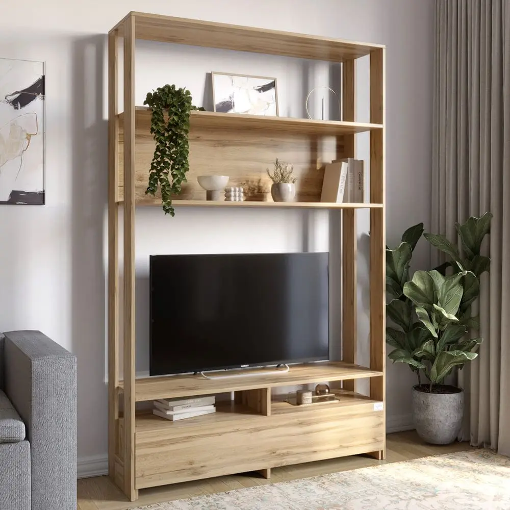 Этот стеллаж не только украсит ваш интерьер, но и обеспечит удобное место для размещения телевизора и других медиа-элементов. Полочки и тумба предлагают достаточно места для хранения книг, декора и других важных вещей, что поможет вам поддерживать порядок в комнате.