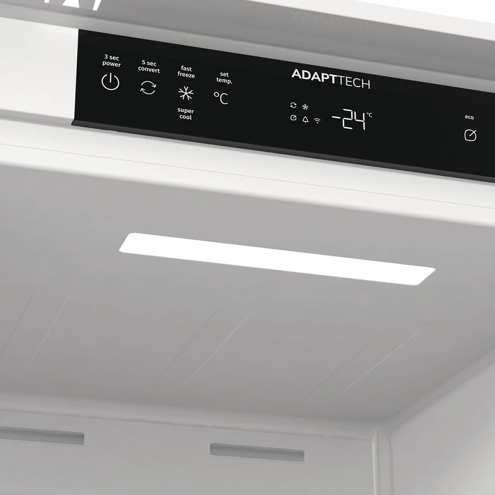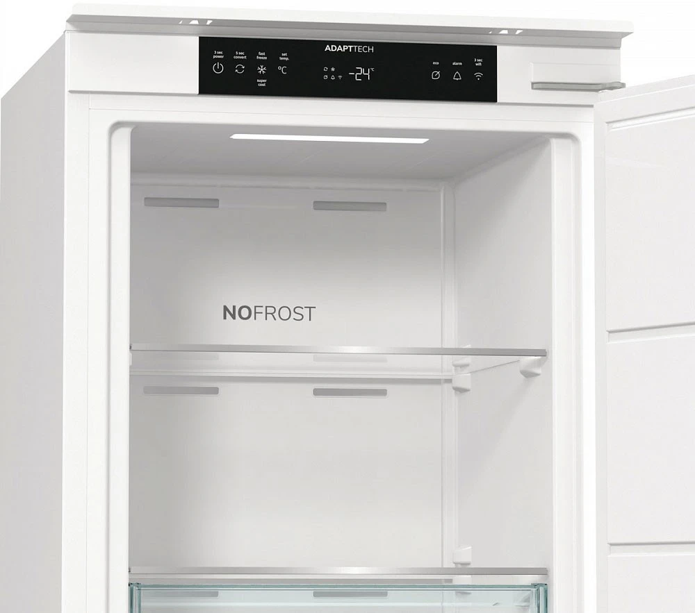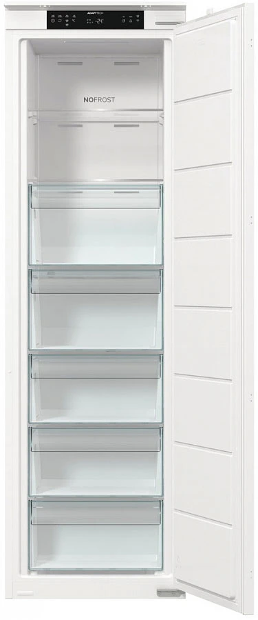 Вбудована морозильна камера Gorenje FNCI517E41WF поєднує місткість 235 літрів із системою NoFrost для стабільного зберігання продуктів без утворення льоду. Інверторний компресор забезпечує рівномірну роботу та контроль температури. Технологія AdaptTech адаптує режим охолодження до циклів відкривання дверцят. Конструкція зі слайдерним кріпленням інтегрується у кухонні меблі. Рівень шуму 35 дБ відповідає умовам житлового простору.