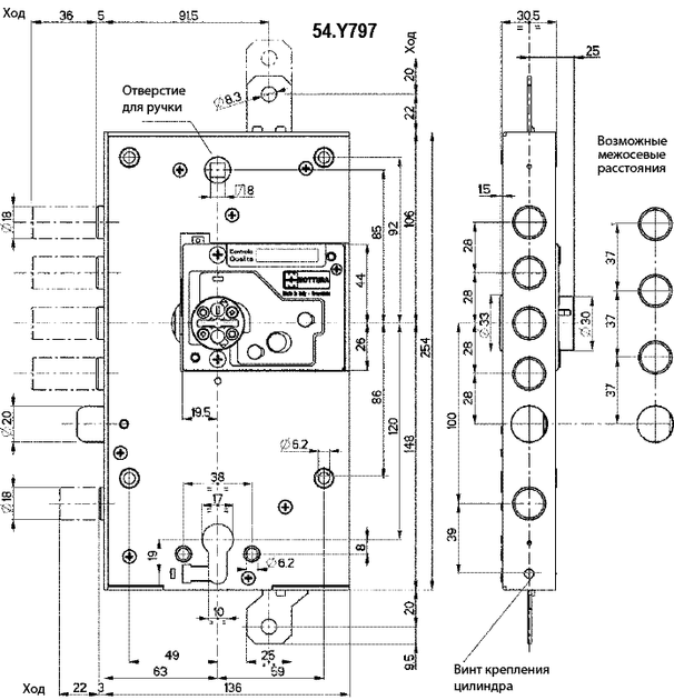 - Габариты лицевой части замка 30х254 мм