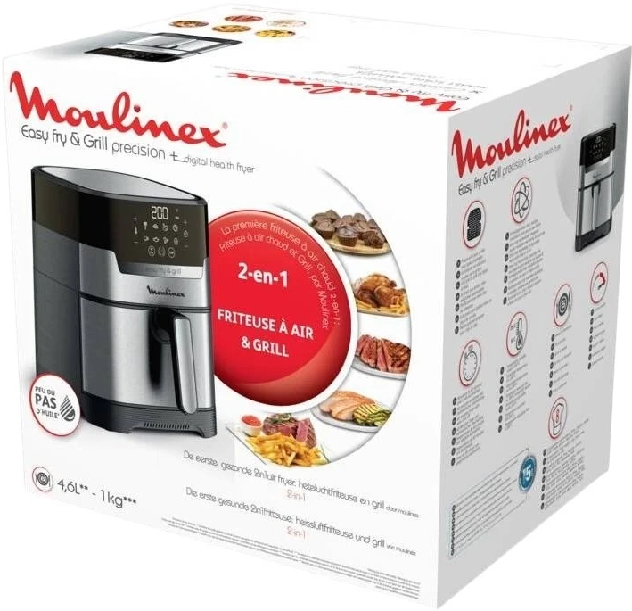 Мультипіч Moulinex EasyFry&Grill Digital з потужністю 1550 Вт та чашею 4,2 л забезпечує приготування на 6 порцій. Технологія Extra Crisp з циркуляцією потоків гарячого повітря та робочою температурою 80-200 °C. Сенсорне керування з 8 автоматичними програмами: картопля фрі, курка, нагетси, риба, м'ясо, піца, овочі, десерт, плюс 2 ручних режими аерофритюр та гриль.