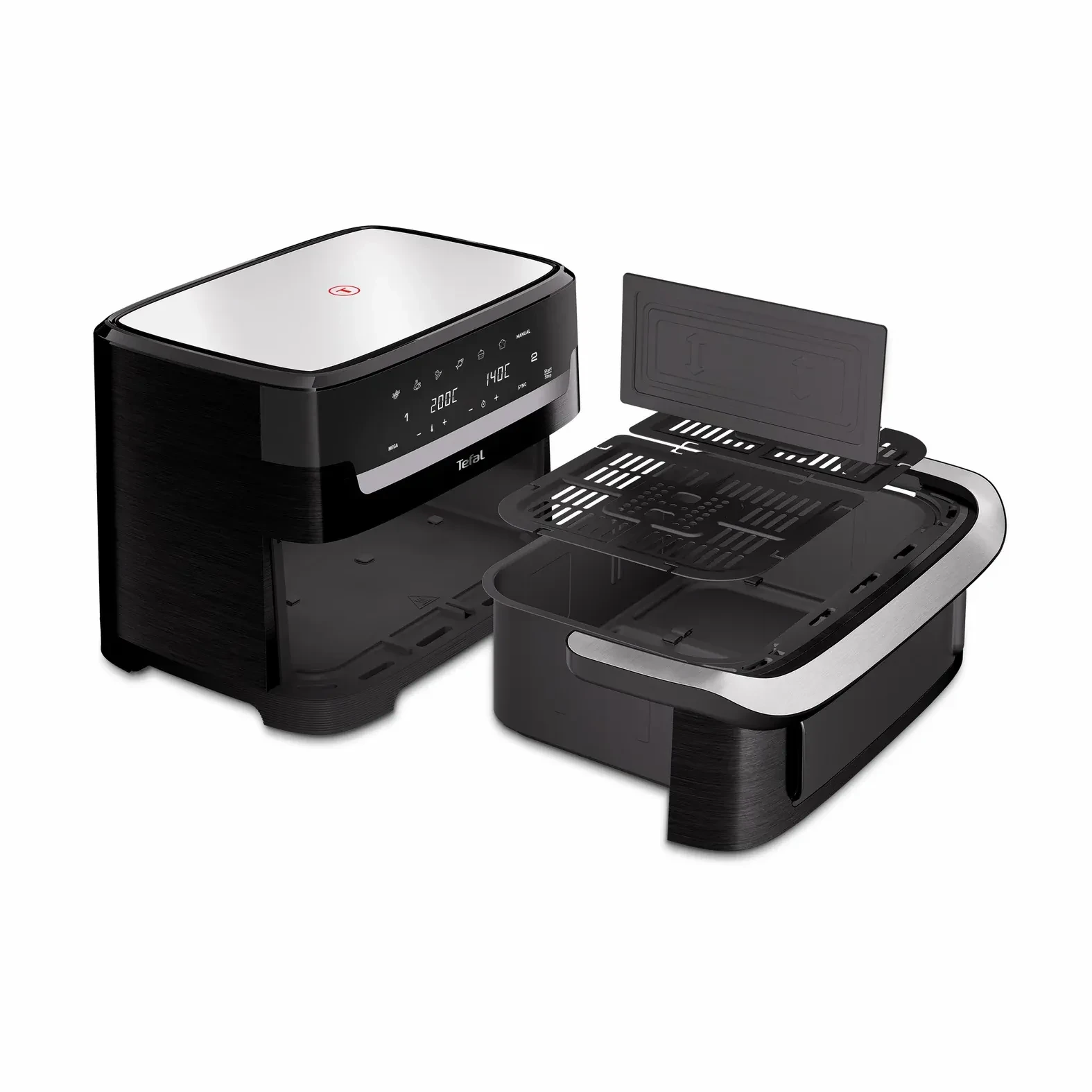 Мультипіч Tefal Dual Easy Fry Flex поєднує універсальність двох незалежних зон та місткість однієї великої чаші GiantZone об’ємом 9 л. Завдяки знімному роздільнику FlexCook можна готувати дві різні страви з окремими налаштуваннями або об’єднати простір для великої порції на всю родину. Технологія Extra Crisp забезпечує циркуляцію гарячого повітря для хрусткого результату з мінімальною кількістю олії, а функція SYNC допомагає синхронізувати завершення приготування двох програм.