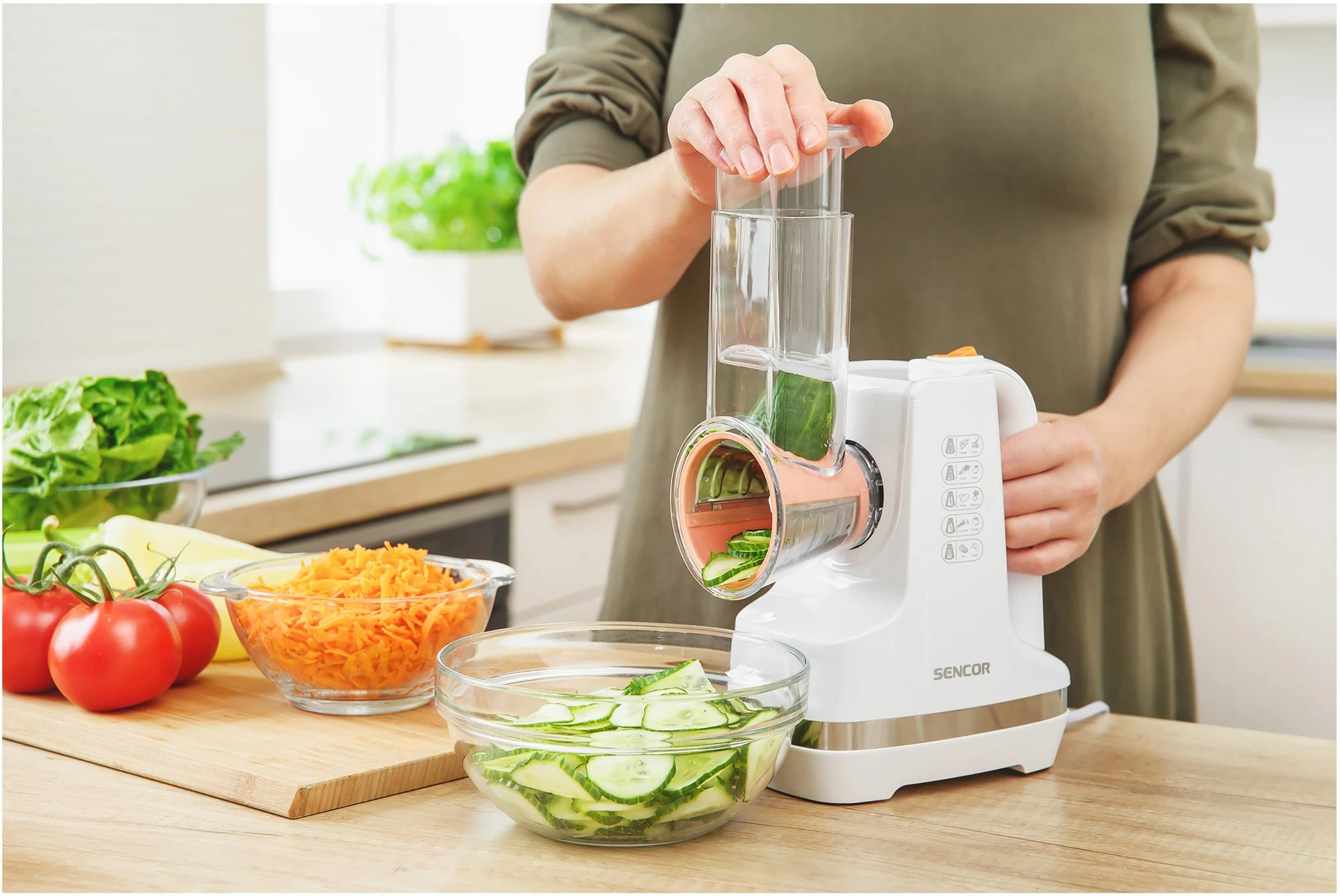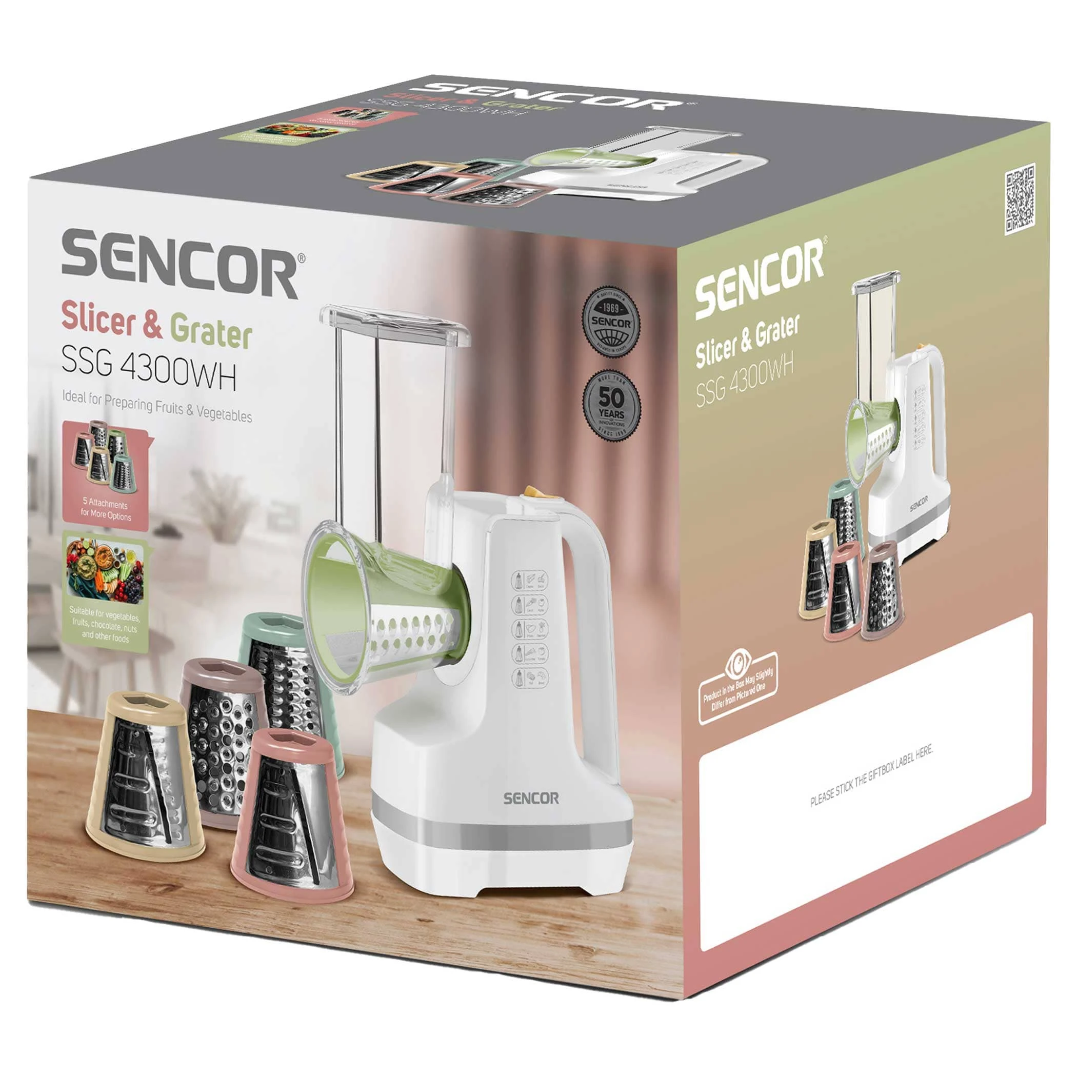 Мультирізка Sencor SSG4300WH — стаціонарний кухонний пристрій для нарізання та натирання фруктів і овочів. Оснащена електродвигуном потужністю 150 Вт і комплектується п’ятьма змінними насадками для різних типів обробки інгредієнтів. Призначена для спрощення щоденної підготовки продуктів без ручного натирання та нарізання.