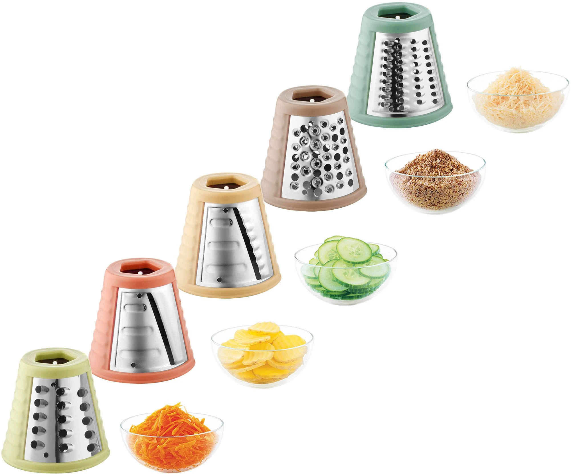 - Насадки слайсер для тонких скибочок; терка для хвилястих скибочок; крупна терка; дрібна терка; сама дрібна т