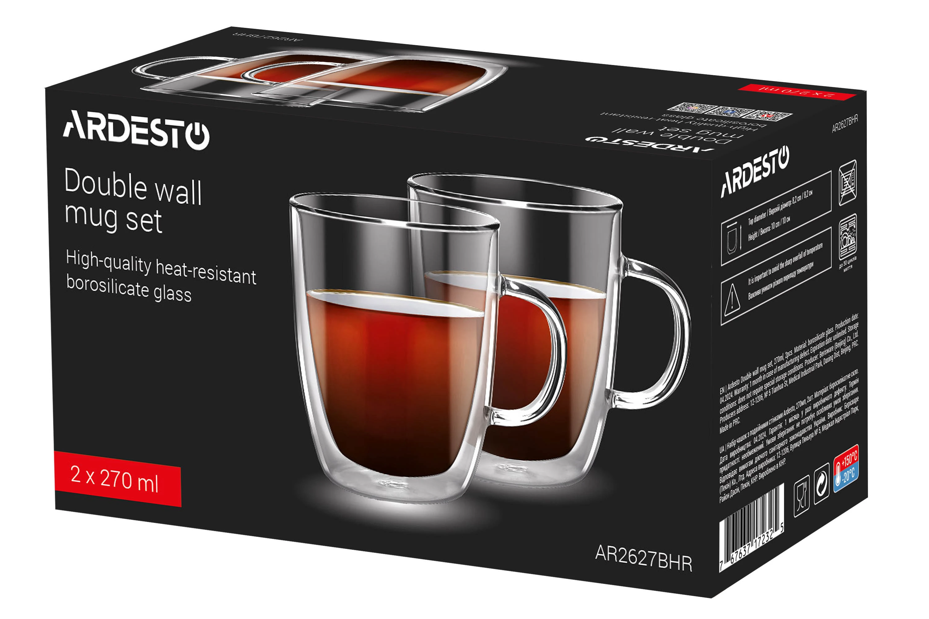 Набір чашок з подвійними стінками. До набору входять дві чашки об’ємом по 270 мл. Чашки виготовлено з термостійкого боросилікатного скла.