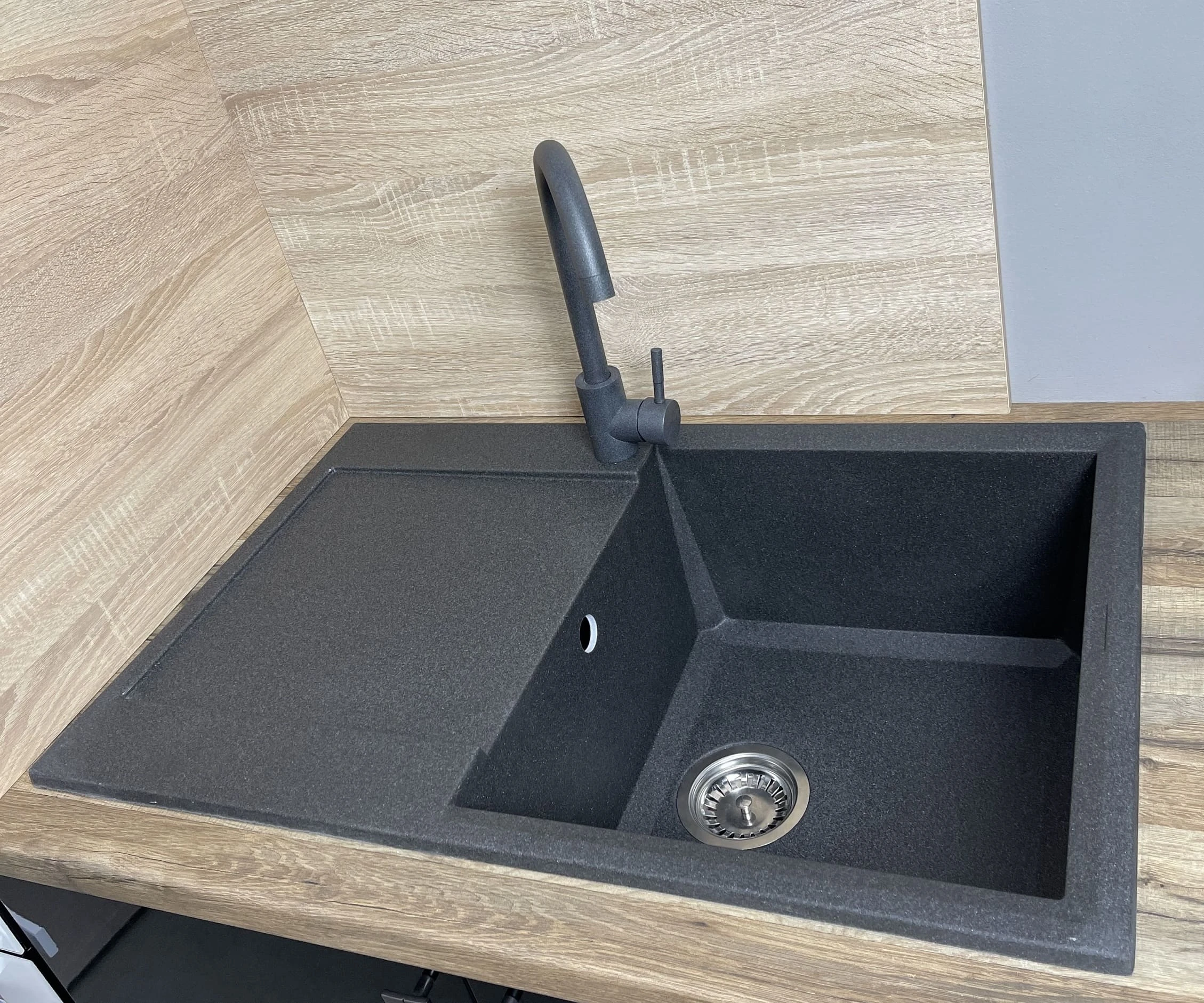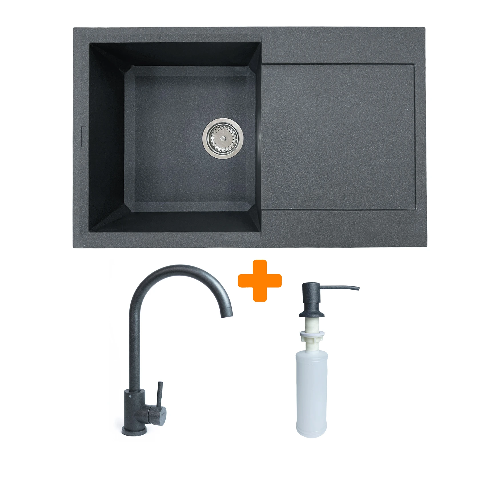 Набір Adamant Horizon поєднує простору мийку зі штучного каменю з крилом, змішувачем та дозатором, створюючи зручний і продуманий кухонний простір. Глибока чаша дозволяє комфортно мити великі каструлі та посуд. Матеріал Solid Surface відзначається стійкістю до температур і щоденних навантажень. Монтаж із нижнім кріпленням забезпечує надійну фіксацію. Це комплексне рішення для сучасної кухні з акцентом на практичність.