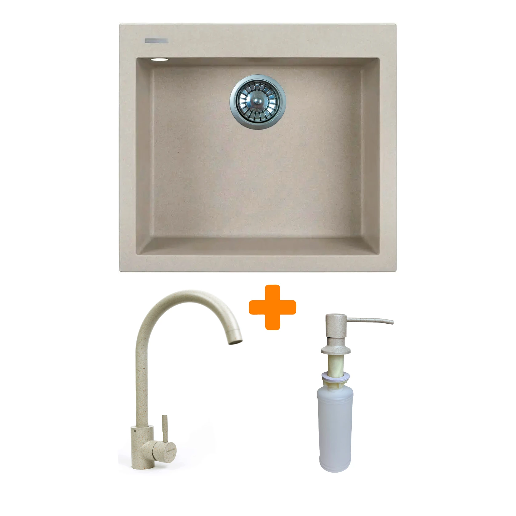 Набір Adamant Univer поєднує квадратну врізну мийку зі штучного каменю, змішувач та дозатор – зручне рішення для продуманої кухні. Технологія Solid Surface забезпечує міцність, термостійкість та простоту догляду. Глибока чаша створює комфорт під час щоденної роботи, а компактна конструкція без крила допомагає раціонально використовувати простір. Дозатор робить подачу мийного засобу акуратною та зручною, підтримуючи порядок у робочій зоні.