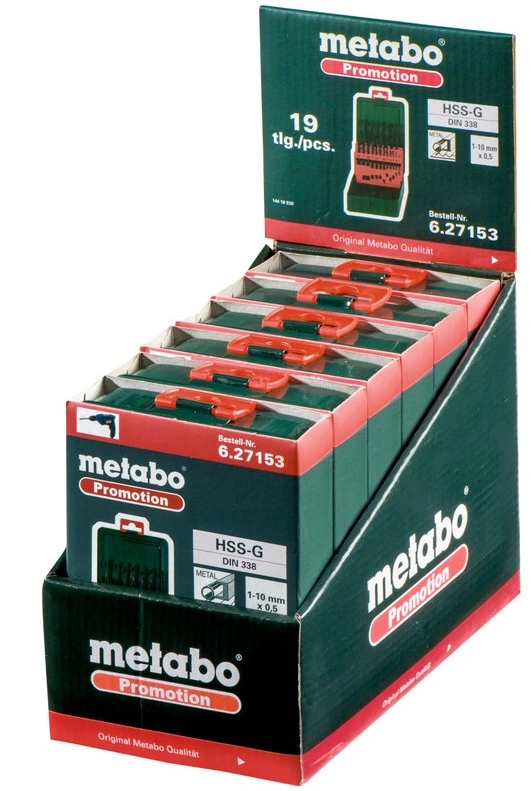 Свердла по металу HSS-G, шліфоване виконання, циліндричні, DIN 338, тип N, хрестоподібна подточка 135°, поверхня полірована, 19 шт., В металевій касеті - O 1 - 10 x 0,5 мм; для свердління отворів в сталі та сталевих виливках, легованих і нелегованих, сірому і ковкому чавуні, чавуні з сфероїдальних включеннями графіту, металокераміці, нейзильберу, графіті, кольорових металах, полімерних матеріалах; міцність при розтягуванні до 900 Н/мм2.