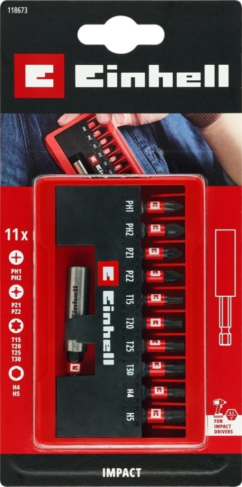 Набір Einhell включає 10 ударних біт 25 мм (PH1, PH2, PZ1, PZ2, T15, T20, T25, T30, H4, H5) та магнітний тримач 60 мм. Біти виготовлені зі сталі S2 з фосфатним покриттям для роботи в ударному режимі. Кожен біт промаркований профілем для швидкого вибору. Компактний кейс з функцією підставки зручно відкривається однією рукою. Ідеально підходить для дому, майстерні та поїздок.