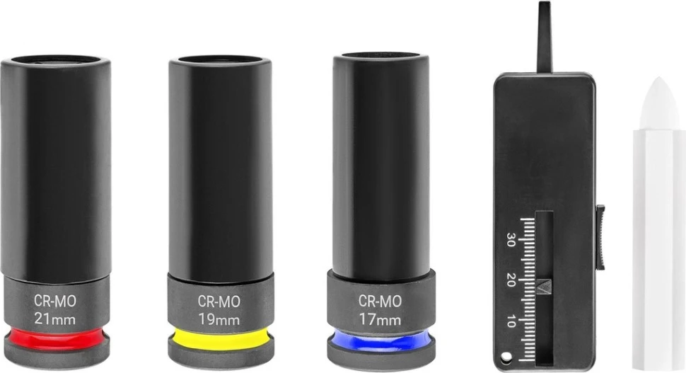 - Комплектация ударна торцева головка 17 мм; ударна торцева головка 19 мм; ударна торцева головка 21 мм; вимірювач