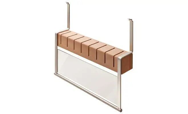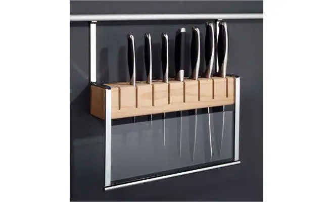 Навісний тримач з дерев'яним блоком для ножів. Несучий елемент тримача виготовлений зі сталі з поверхнею під нержавіючу сталь, захисна кришка виготовлена з акрилового скла, дерев'яний блок виготовлений з масиву бука. Розміри тримача: ширина 380 мм, глибина 80 мм, висота 370 мм.