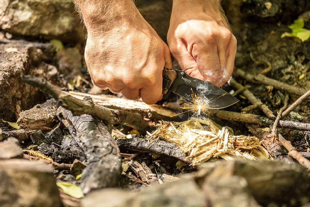 Складаний ніж для виживання NEO (арт. 63-107) із загальною довжиною 22 см та лезом 9 см - це багатофункціональний інструмент 6-в-1. У нього входять: ніж, крем'яний замок, свисток, гайковий ключ, лопатка для ременя та склобій. Він виготовлений із високоякісної нержавіючої сталі, яка стійка до механічних пошкоджень. Ручка виготовлена із міцного пластику для надійного захоплення. Ніж має кліпсу для кріплення на поясі, що дозволяє завжди мати інструмент під рукою.