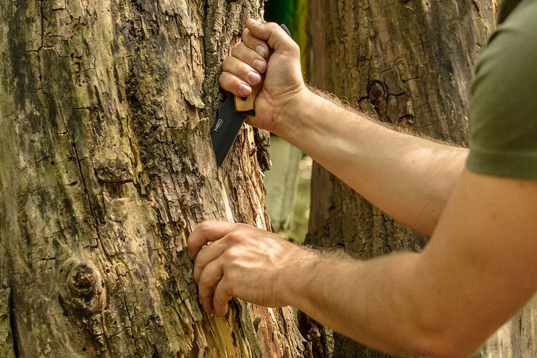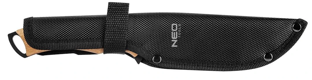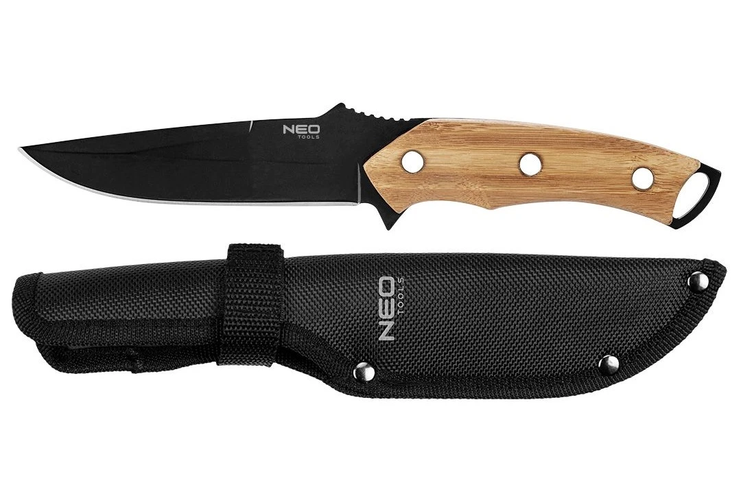 Тактичний ніж Full-Tang, 63-110, NEO, довжиною 25 см з клинком 14,5 см, виготовлений з високоякісної нержавіючої сталі, стійкий до механічних пошкоджень та з матовим покриттям. Цей ніж незамінний для походів у гори, кемпінгу у лісі чи трекінгу. Бамбукова ручка забезпечує надійне захоплення та високу міцність. У ножа є чохол із кріпленням на поясі.