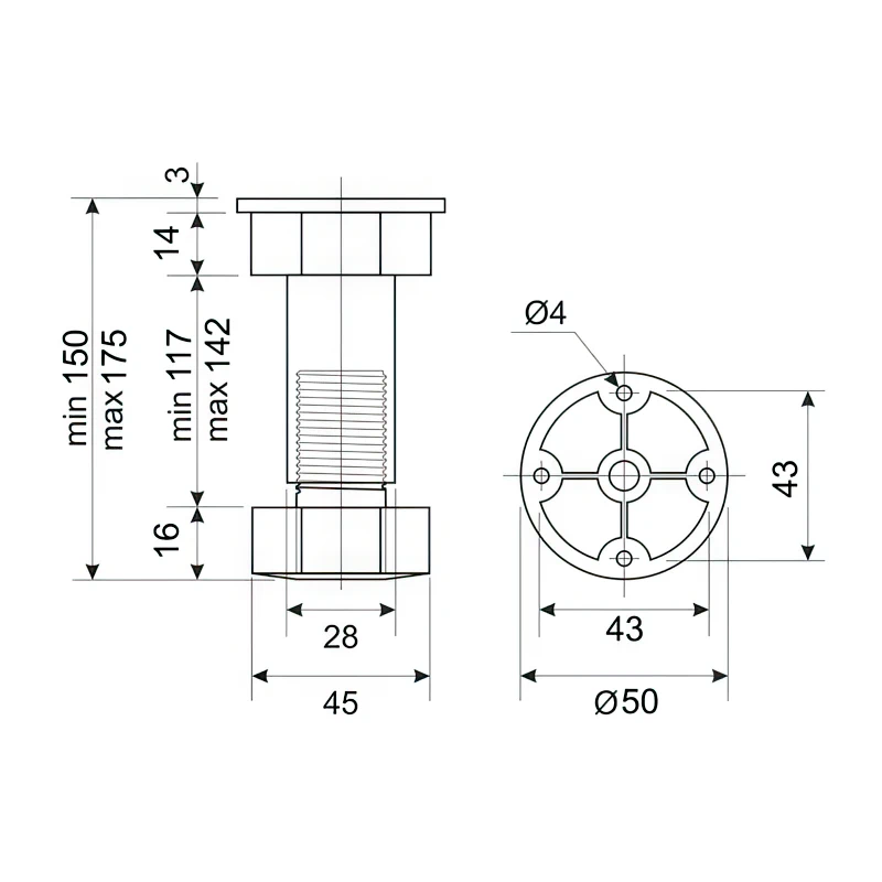 Ножная мебельная регулируемая пластиковая DC Н-150мм Черный