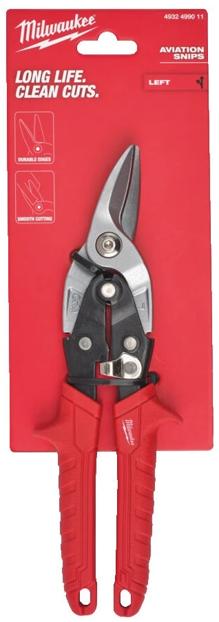 Ножиці по металу Milwaukee ліві (4932499011) — професійний інструмент довжиною 251 мм з червоного рукоятками для лівостороннього різання листового металу, нержавіючої сталі та алюмінію. Ковані сталеві леза з лазерно/індукційно-закаленими ребрами та хромованим покриттям забезпечують чисті надрізи без задирок на оцинкованих і пофарбованих поверхнях. Ребристі ребра запобігають ковзанню, а важільний шарнір з торсіонною пружиною зменшує зусилля та автоматично відкриває щелепи. Ергономічні двокомпонентні рукоятки з антиковзким покриттям та металевим замком полегшують роботу в рукавичках. Вага 0,43 кг робить інструмент зручним для щоденного використання в вентиляції, покрівлі чи загальних роботах з металом.