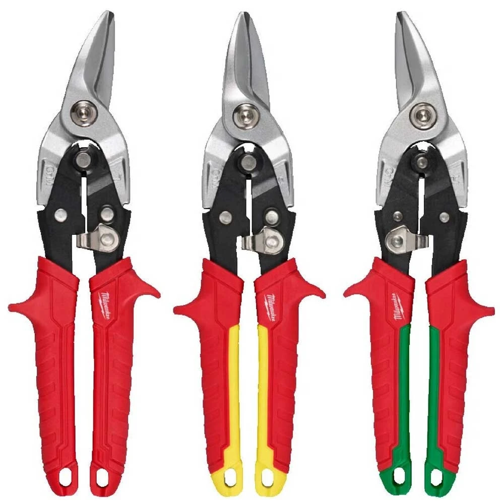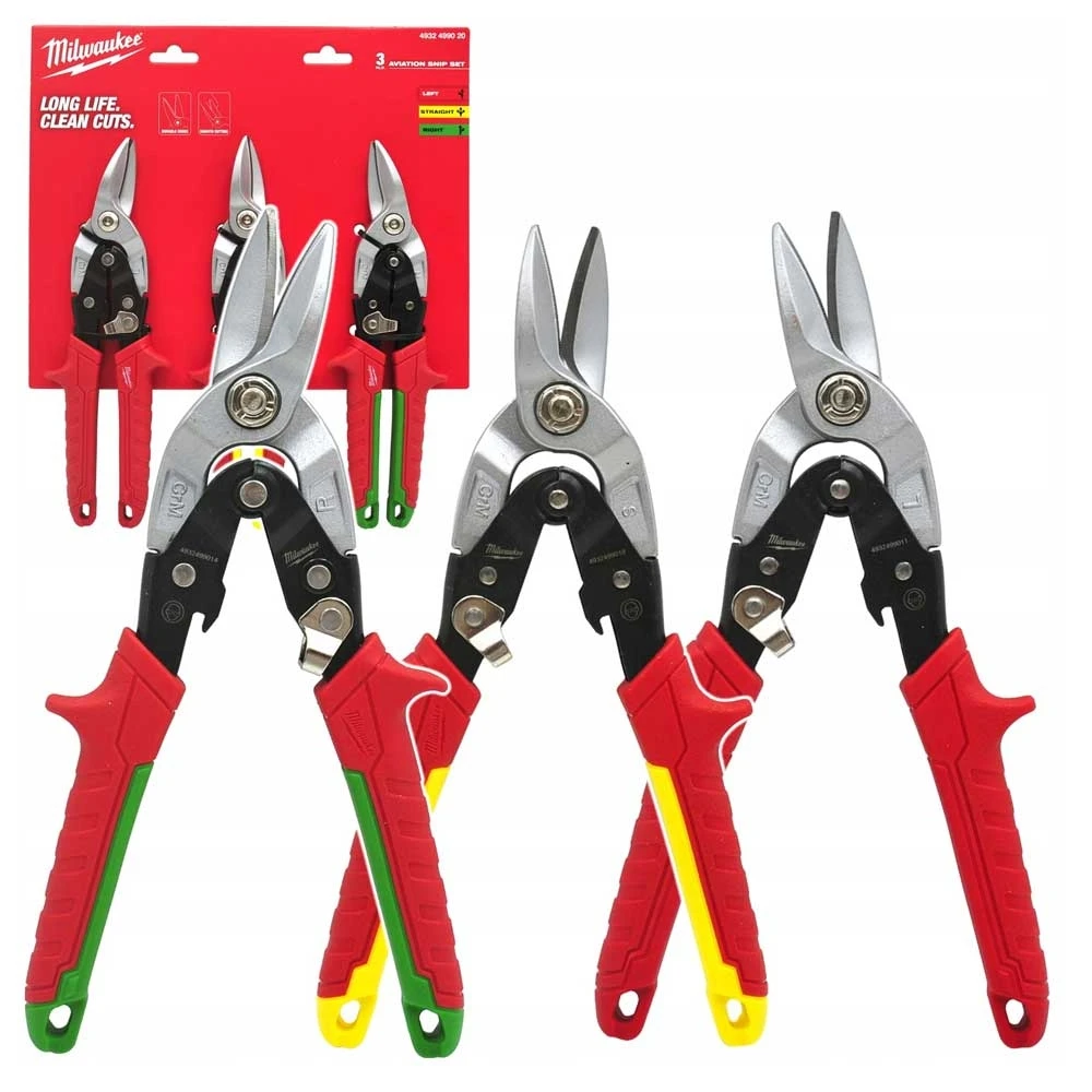 Набір ножиць по металу Milwaukee (4932499020) — професійний комплект з трьох інструментів довжиною 251 мм (прямі, праві та ліві) з кованими сталевими лезами для точного різання листового металу, нержавіючої сталі та алюмінію. Зубчасті ребра з хромованим покриттям запобігають ковзанню, а важільний шарнір з торсіонною пружиною зменшує зусилля та автоматично відкриває щелепи. Ергономічні рукоятки з м'яким антиковзким покриттям та металевим замком полегшують роботу в рукавичках, з отвором для карабіна. Колір-кодування рукояток спрощує вибір напрямку різу, вага 0,43 кг на пару робить набір зручним для щоденних завдань. Така конструкція підходить для вентиляції, покрівлі чи металообробки.