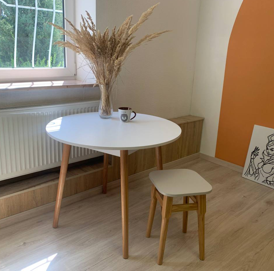 Модель изготовлена из качественной ламинированной ДСП, что обеспечивает износостойкость и простоту в уходе. Деревянные ножки также покрыты ламинатом, что повышает их прочность и придаёт эстетичности. Стол сочетает в себе практичность, изящество и долговечность — всё, что нужно для повседневного использования.