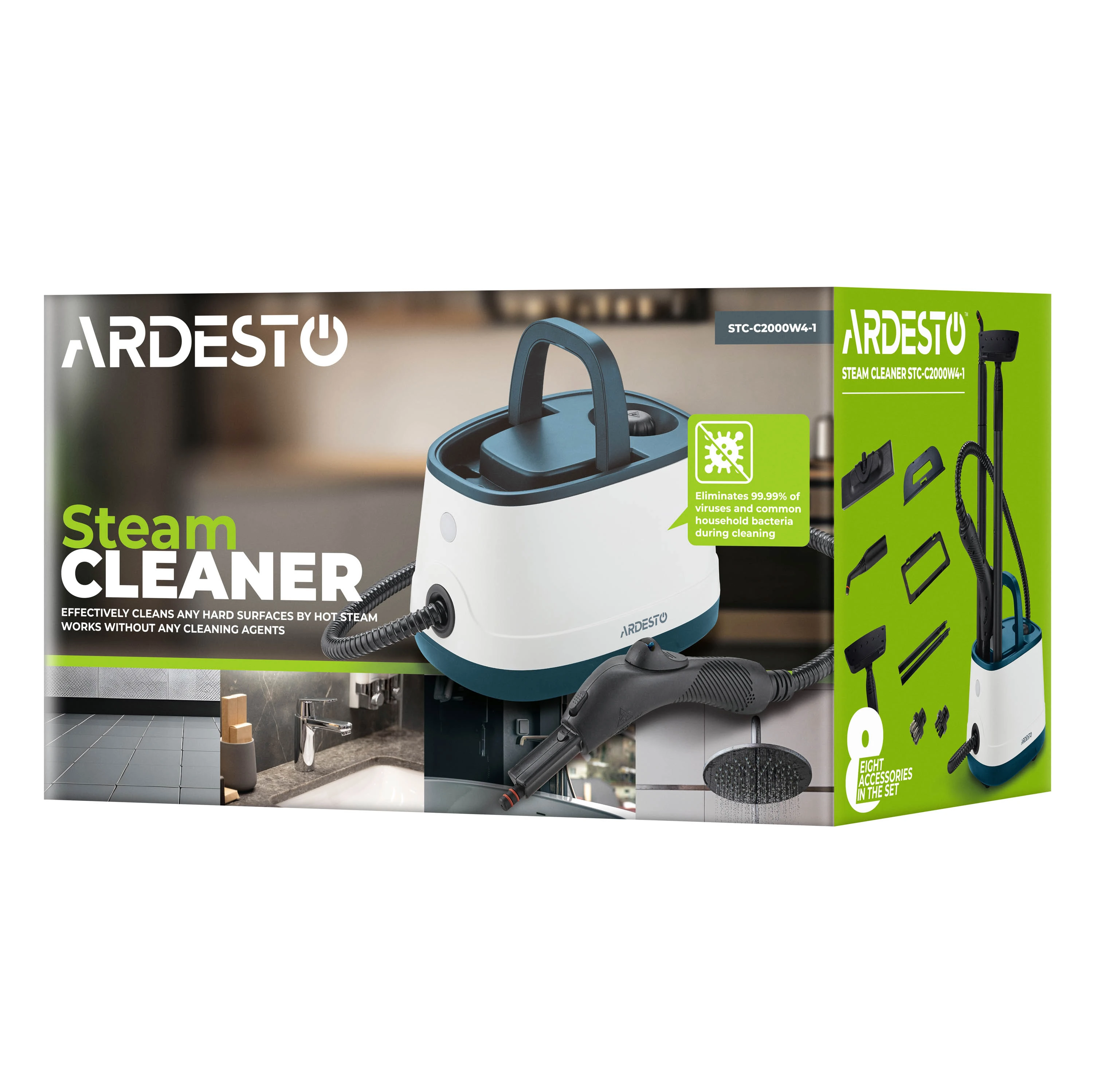 Пароочисник STC-C2000W4-1 – потужний пристрій для глибокого очищення твердих поверхонь без використання хімії. Температура пари становить до 165 °C, тиск – 4 бар, що є запорукою ефективного знищення до 99,99 % побутових бактерій і вірусів. Резервуар об’ємом 1,5 л забезпечує тривале прибирання без перерв, а готовність за 5 хв – швидкий старт у будь-який момент. У комплекті – 8 насадок для різних завдань: миття вікон, очищення килимів, прасування, доступ до важкодоступних місць. Пристрій оснащено системою захисту, регулюванням пари та довгим шнуром живлення, що сприяє комфортному користуванню. Потужність 2 000 Вт гарантує стабільну роботу навіть під час масштабного прибирання.