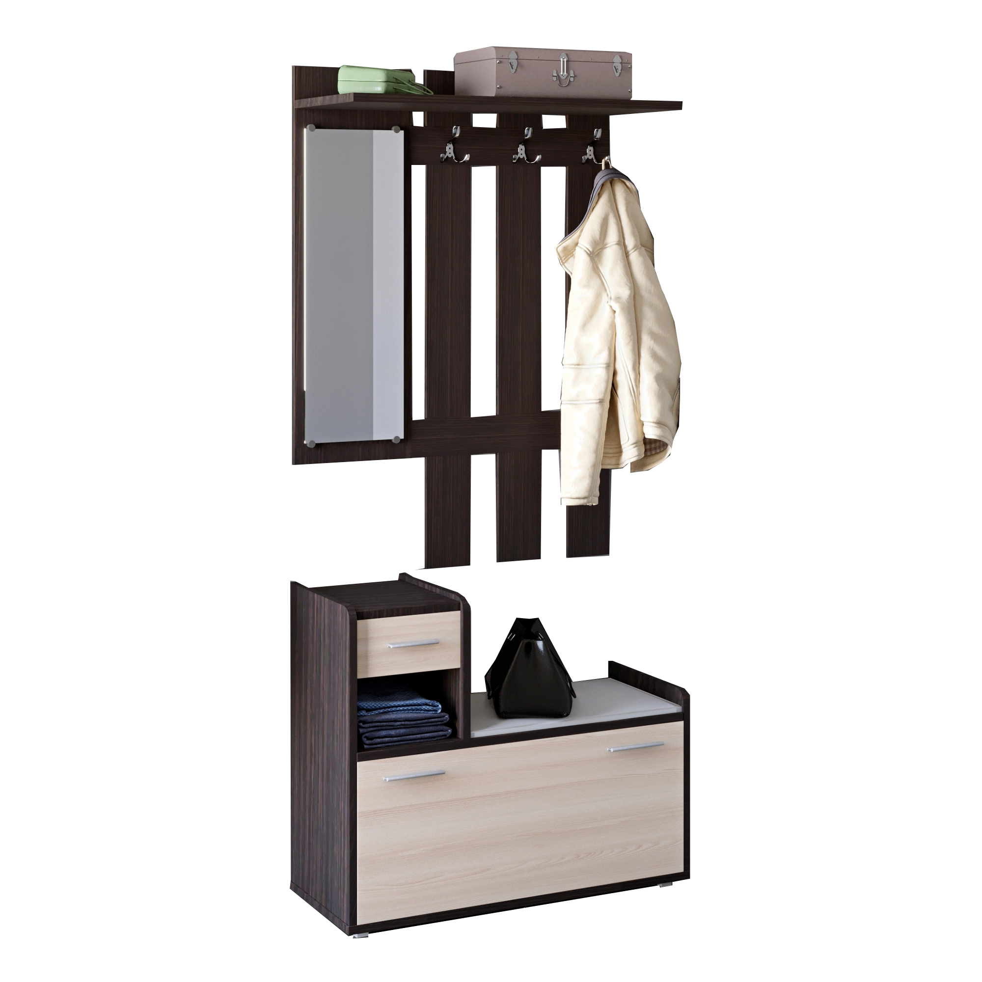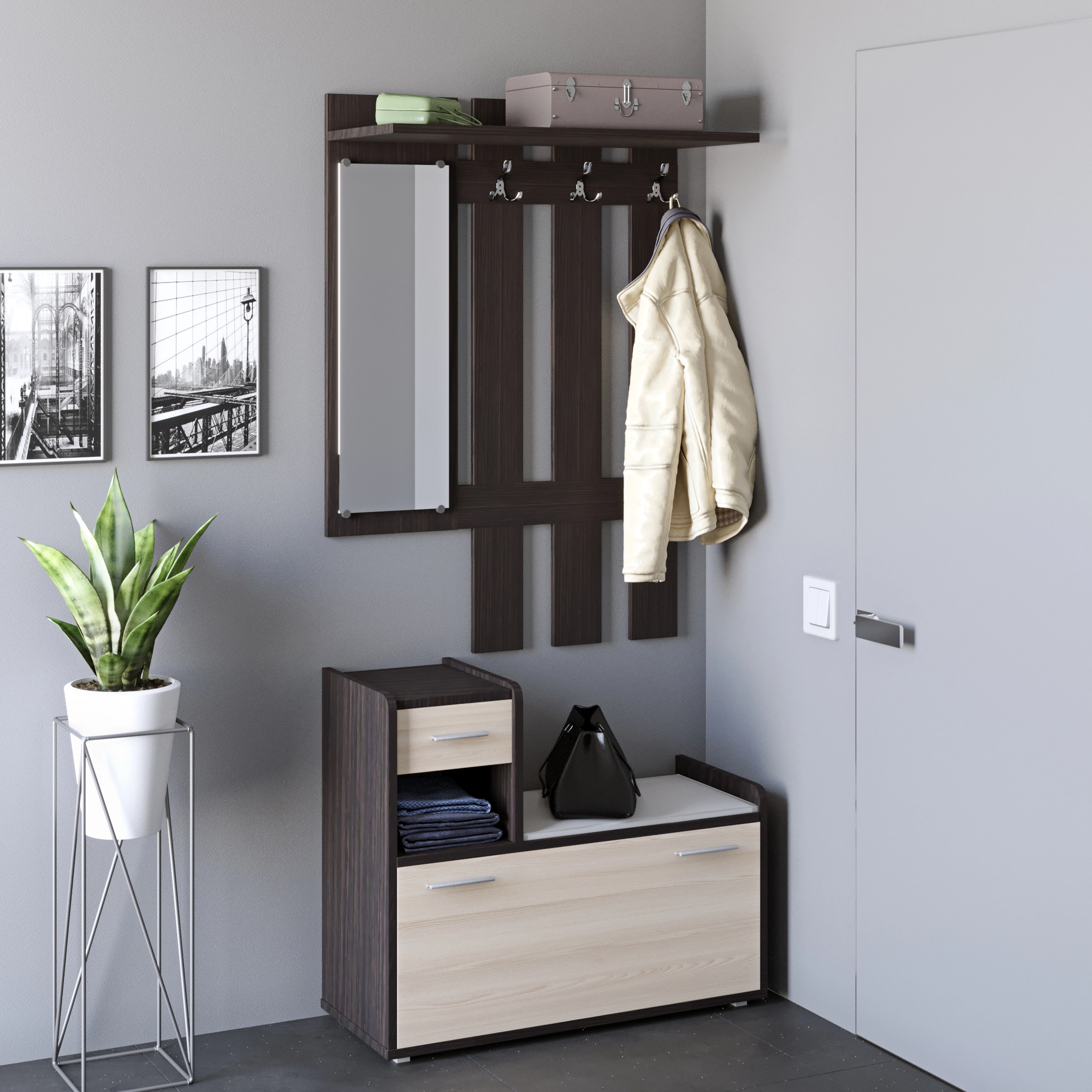 Створіть стильний та функціональний простір у вашому домі з передпокою Еверест Тандем. Вішалка та тумба для взуття, виконані в елегантному поєднанні венге та дуба молочного, нададуть вашому інтер'єру сучасного вигляду. Завдяки продуманому дизайну, цей комплект не лише прикрасить ваш коридор, але й забезпечить зручне зберігання верхнього одягу та взуття.