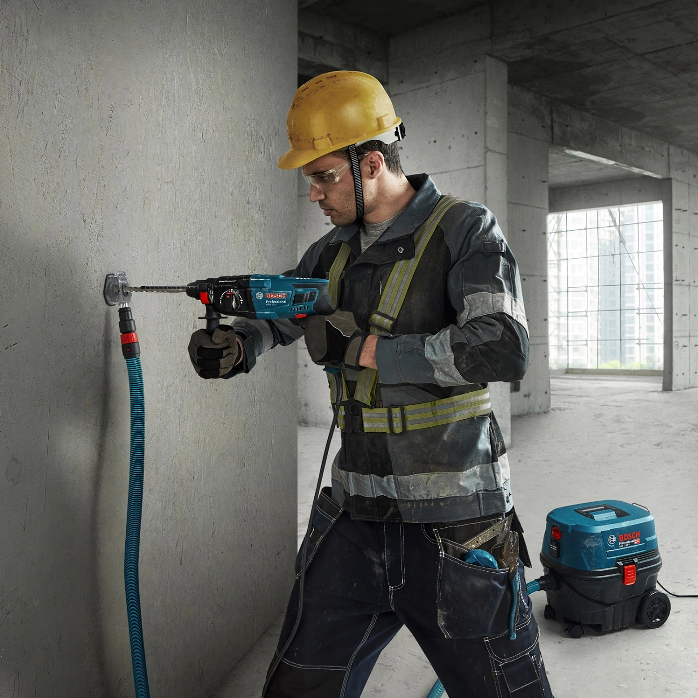 GBH 220 Bosch Professional - мережевий перфоратор потужністю 720 Вт і силою удару в 2 Дж для ефективного свердління в бетоні. Універсальність використання завдяки 3 режимам роботи: свердління з ударом, свердління і довбання. Функція Vario-lock забезпечує оптимальне положення зубила при довбанні, а плавне регулювання швидкості дозволяє домогтися точності при свердлінні. Зручність у роботі забезпечується прорезиненою рукояткою, довгим шнуром в 4 метри, а також можливістю фіксації кнопки в робочому положенні для безперервної роботи. Обслуговування інструменту не складає труднощів завдяки новій системі швидкої заміни вугільних щіток.