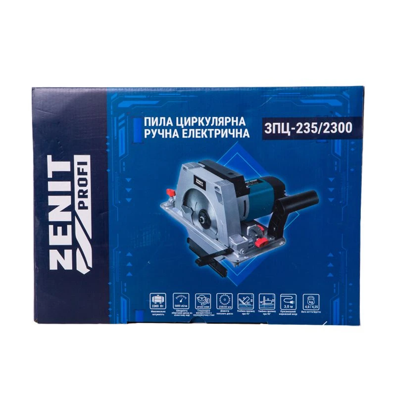 Пила циркулярна ручна електрична ЗЕНИТ ЗПЦ-235/2300 Профи – це спеціалізований інструмент для розпилювання пиломатеріалів вздовж і впоперек волокон, пластиків, деревовмісних композитів (ДСП, ДВП, ЦСП та подібних), тонких панелей з кольорових металів на заготовки з прямим різанням та під нахилом, з обов’язковим використанням твердих опор.