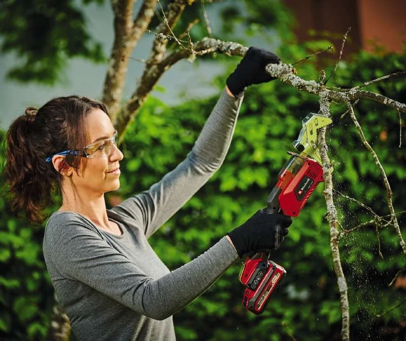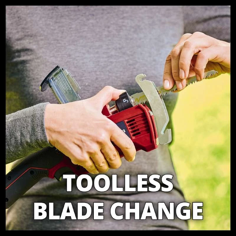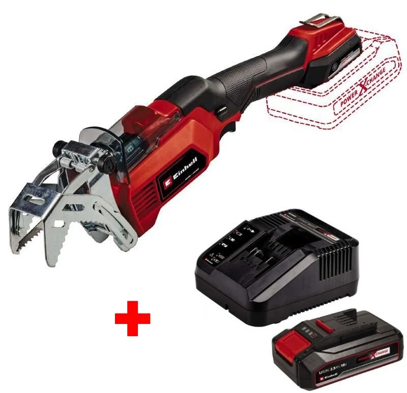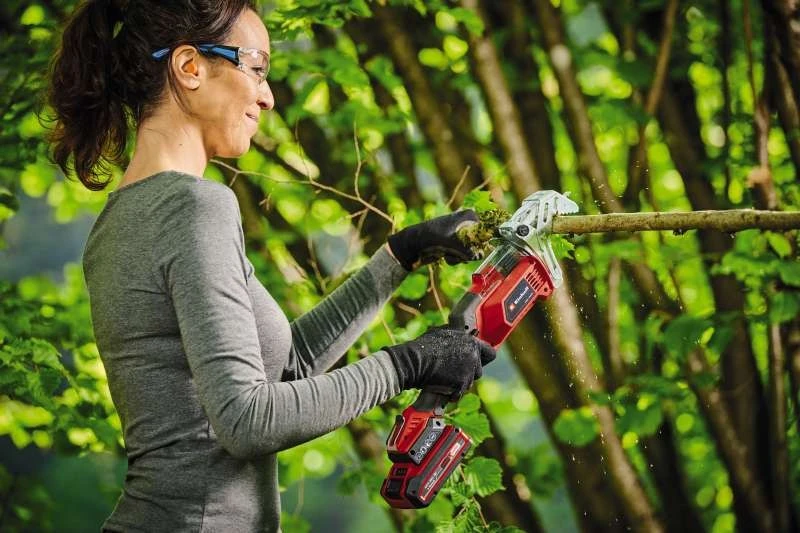 Einhell GE-GS 18/150 Li Kit — компактна акумуляторна шабельна пила-ножівка вагою 1,28 кг для обрізання гілок дерев і кущів діаметром до 100 мм без кронштейна та до 80 мм із кронштейном для гілок. Частота ходу 1500–2800 хв⁻¹ і хід 20 мм забезпечують чистий і швидкий різ однією рукою. Знімний кронштейн для гілок, безключова заміна полотна, захисна кришка тримача і двосторонній запобіжний вимикач роблять роботу безпечною і зручною. У комплекті акумулятор 18В 2,5 А·год, зарядний пристрій і два пильні полотна KWB (Швейцарія).