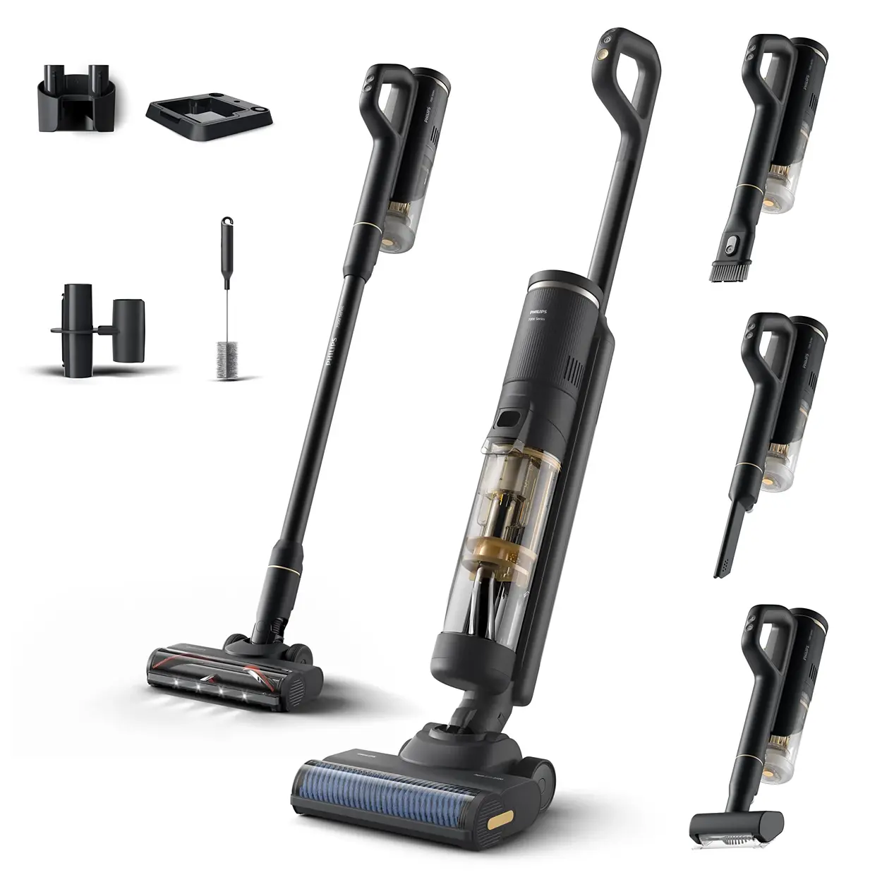 Philips AquaTrio — це багатофункціональний бездротовий пилосос 3-в-1 для сухого, вологого та ручного прибирання. Оснащений потужними щітками AquaSpin зі швидкістю 2500 об/хв, інтелектуальними режимами роботи, LED-підсвіткою для виявлення пилу, гнучкою конструкцією для прибирання під меблями та автоматичною системою очищення без потреби ручного миття. Ідеально підходить для щоденного догляду за підлогою, зокрема в оселях із домашніми тваринами.