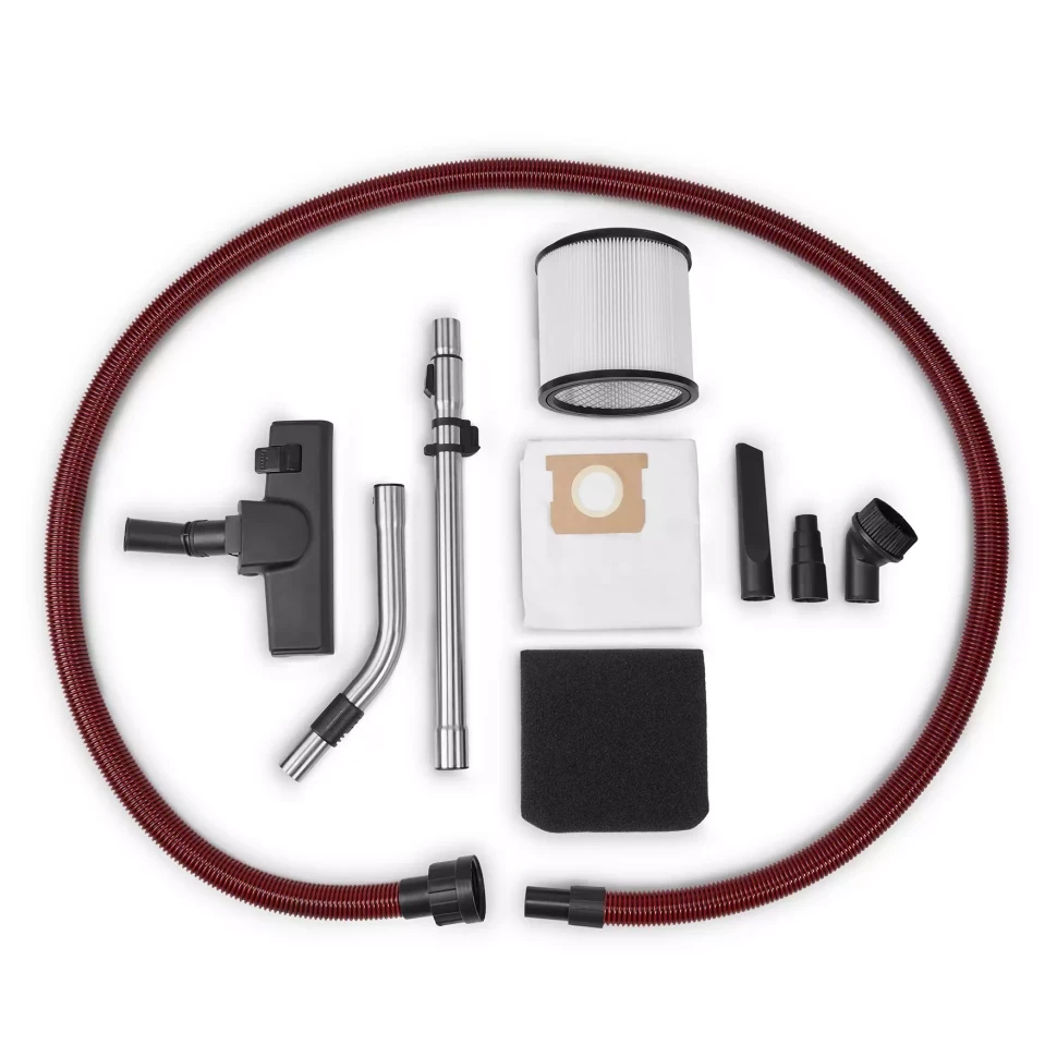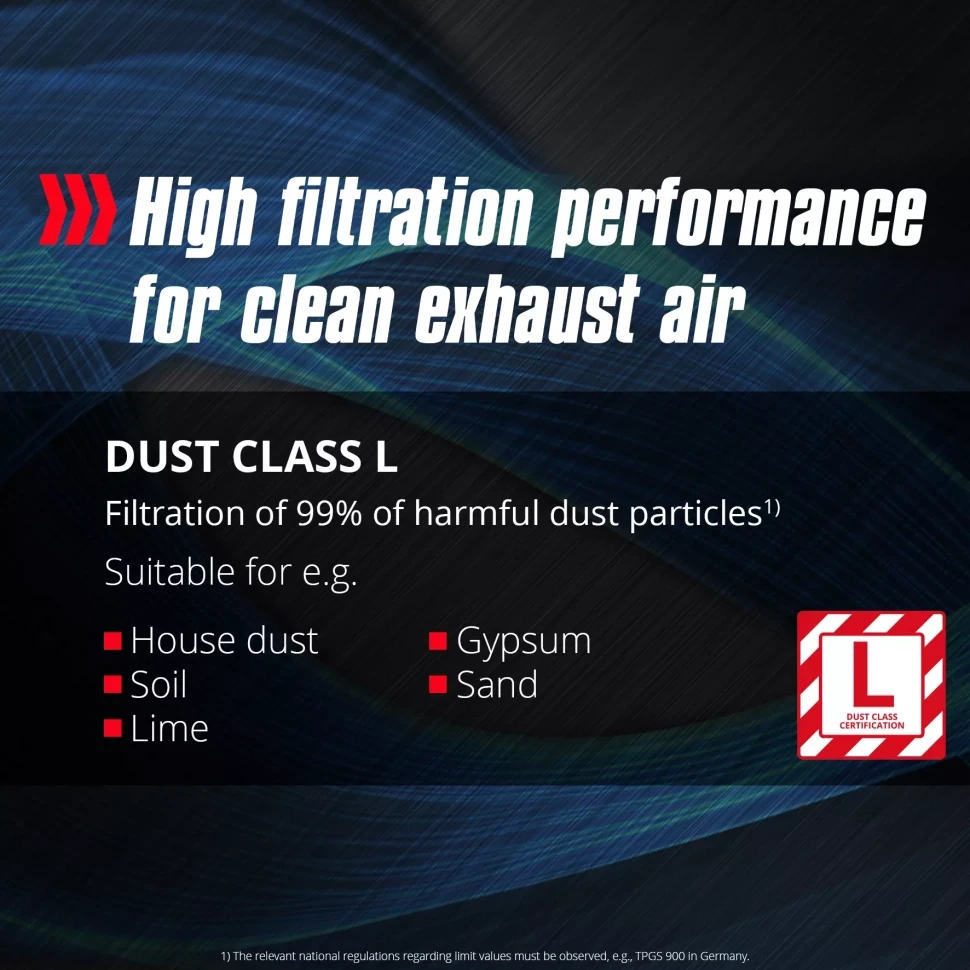 Einhell TE-VC 2580 SACL — професійний пилосос для вологого та сухого прибирання з двигуном 1100 Вт і силою всмоктування 200 мбар. Бак із нержавіючої сталі об'ємом 25 л витримує як рідини, так і будівельний пил класу L — штукатурку, вапно, пісок і ґрунт. Гофрований HEPA-фільтр затримує найдрібніші частинки, а система очищення фільтра одним натисканням кнопки відновлює максимальну потужність всмоктування. Шланг 3 м і кабель 5 м забезпечують радіус дії 8 м.