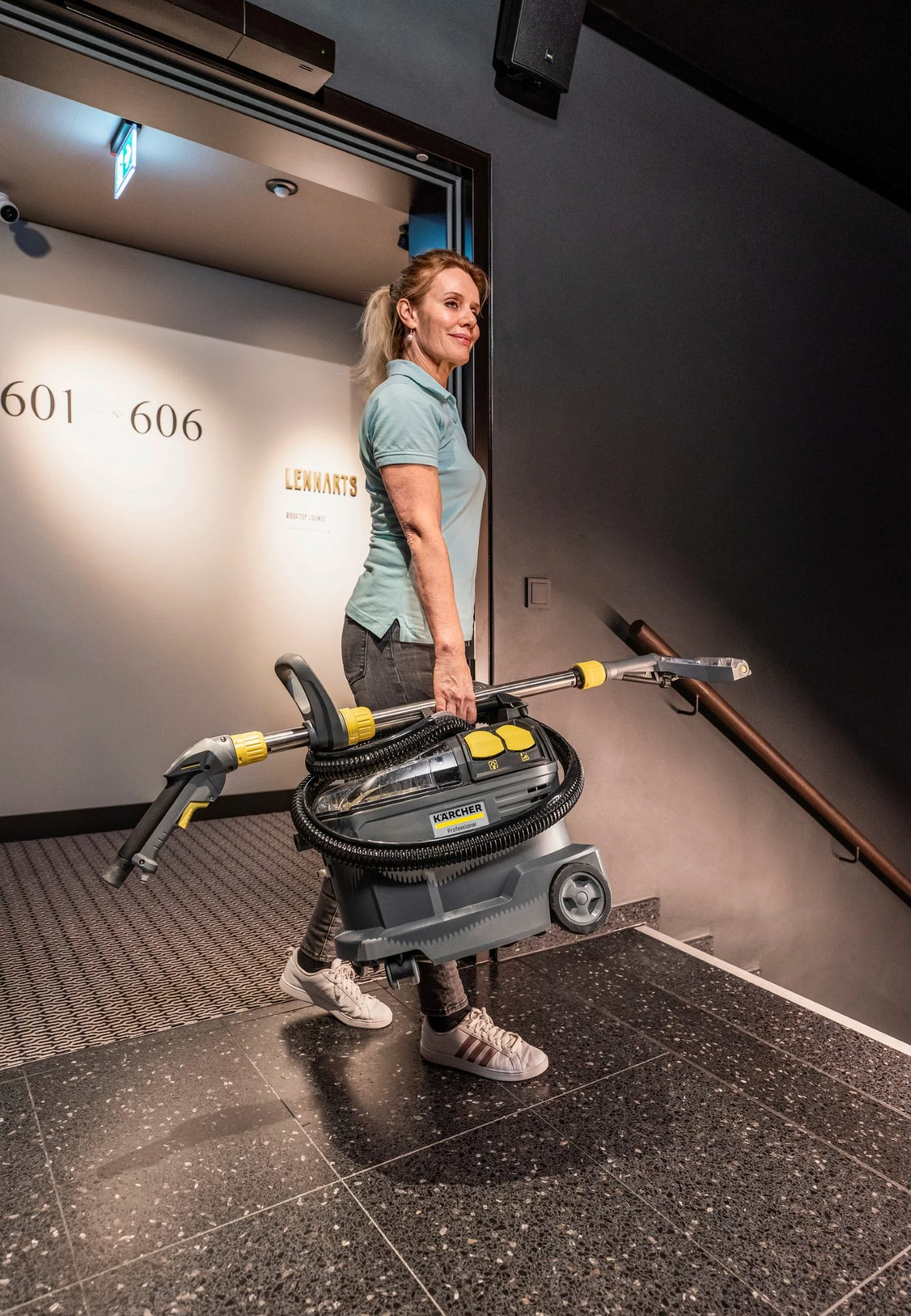Професійний миючий пилосос Karcher Puzzi 8/1 Adv ефективно очищає килими, меблеву оббивку та інші текстильні поверхні завдяки глибокому розпиленню миючого розчину і швидкому збору вологи. Прозора кришка, насадки та оглядове вікно в рукоятці забезпечують контроль процесу. Легка вага, ергономічна ручка та великі кнопки роблять апарат зручним у використанні. Компактна й міцна конструкція гарантує тривалий термін служби, що особливо цінно для клінінгових компаній, готелів, ресторанів та сервісів з хімчистки автомобілів.