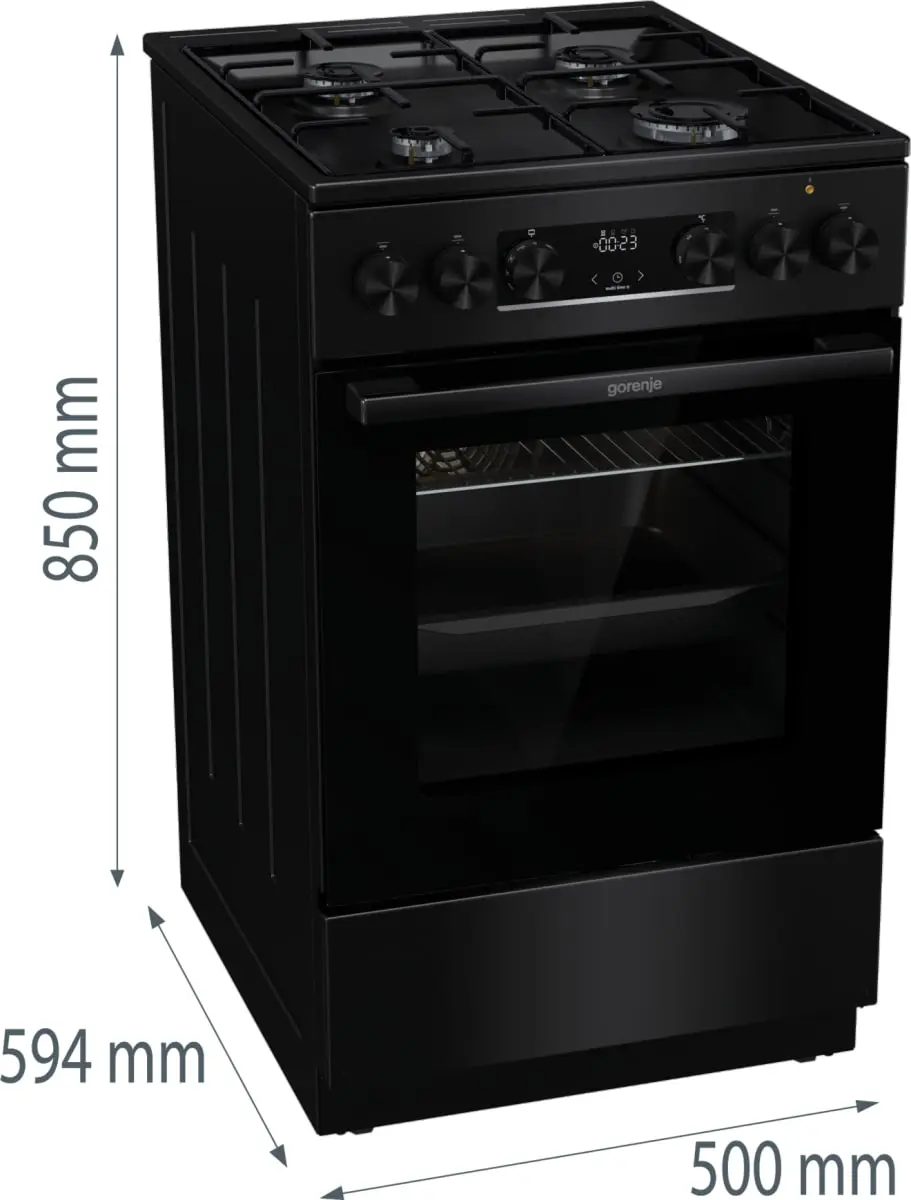 Gorenje GK5C60BJ — это современная **комбинированная плита** с **газовой варочной панелью** и **электрической духовкой объёмом 62 литра**, оснащённая **дисплеем IconLed**, грилем и подсветкой. Модель имеет **эмалированные решётки**, удобное управление и лаконичный дизайн в **чёрном цвете**, который идеально подойдёт к современной кухне.