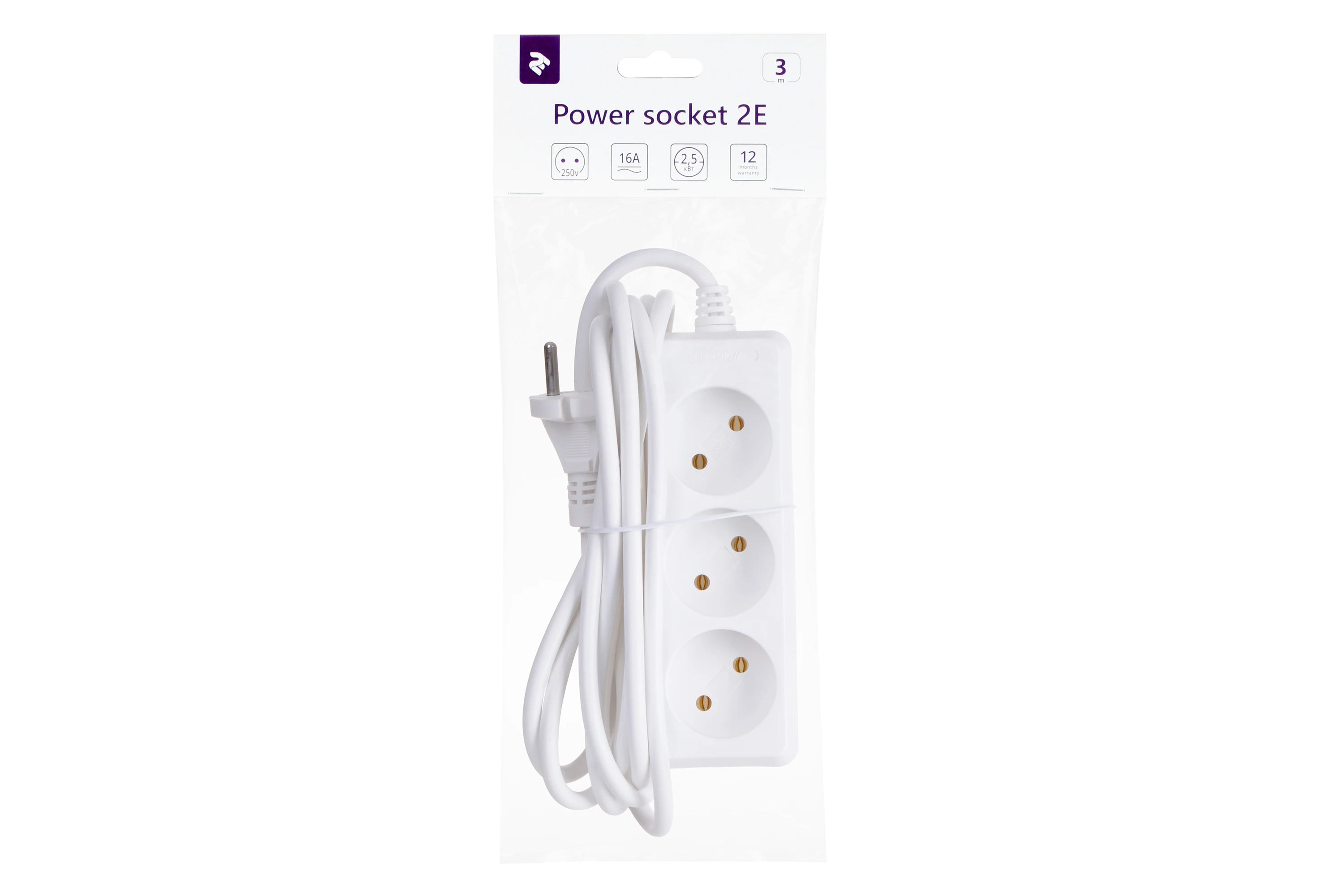 Мережевий подовжувач 2E модель U03M3 призначений для підключення офісної та побутової техніки сумарною потужністю до 2,5 кВт. Має три розетки типу CEE7/17 без заземлення, двожильний кабель із перерізом жили 1 мм², матеріал провідника – мідь. Білого кольору, довжина кабелю 3 м.