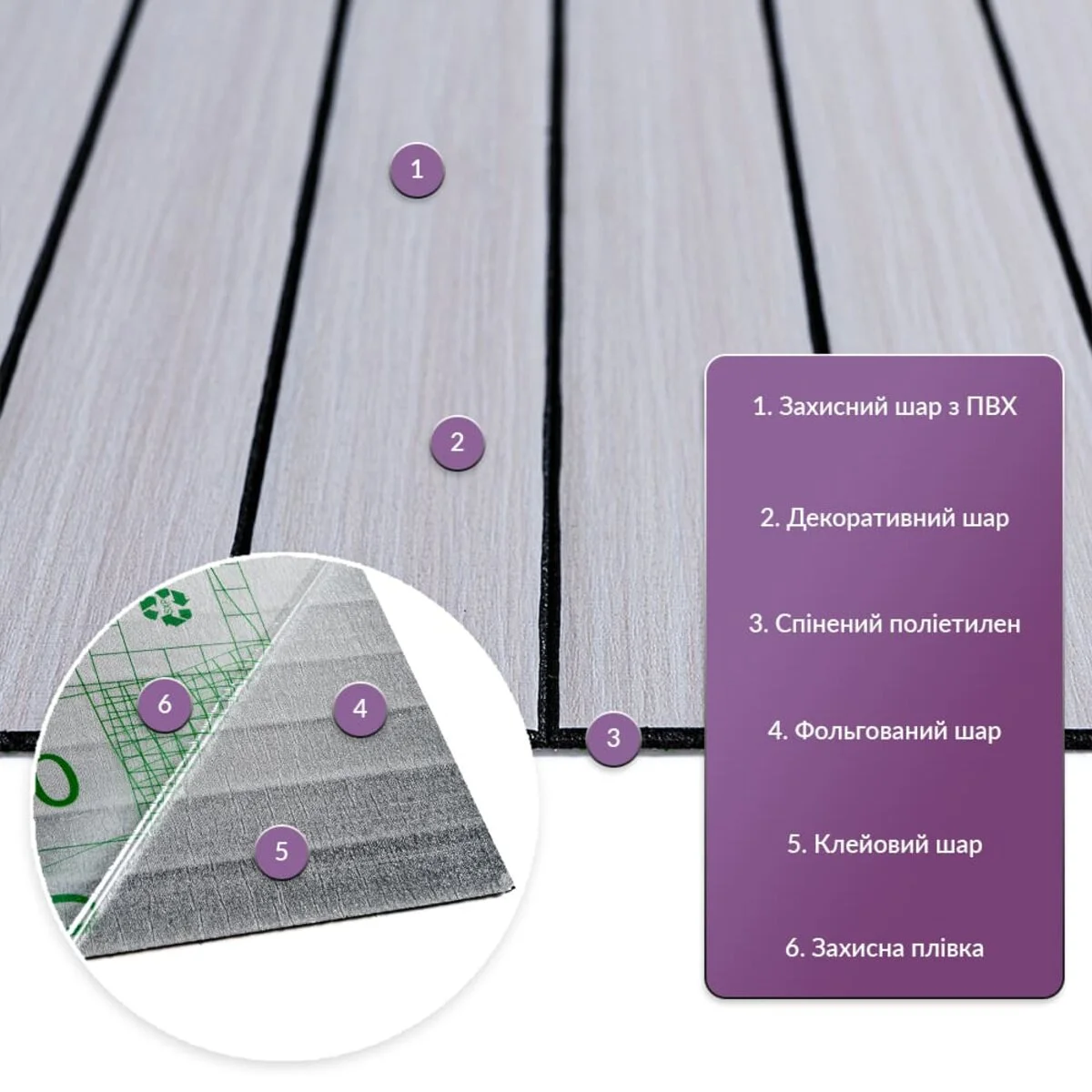 • Декоративний шар: плівка з кольоровим друком високої роздільної якості, яка повністю імітує фактуру природних матеріалів завдяки чіткому та деталізованому зображенню.