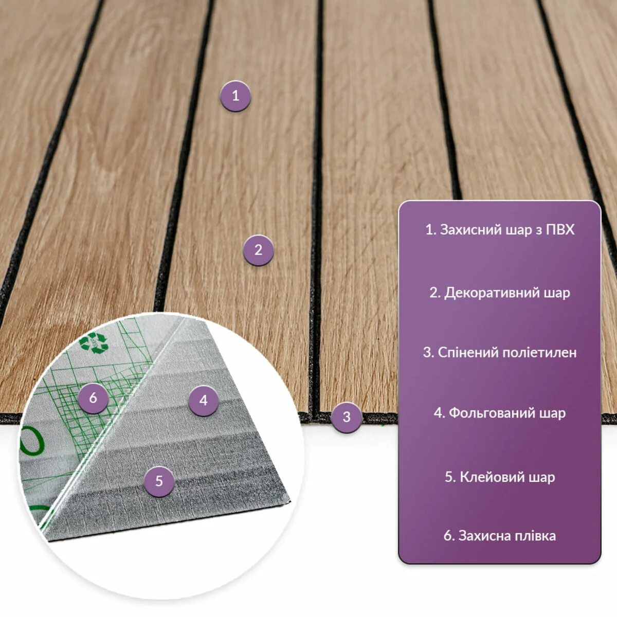 • Декоративний шар: плівка з кольоровим друком високої роздільної якості, яка повністю імітує фактуру природних матеріалів завдяки чіткому та деталізованому зображенню.