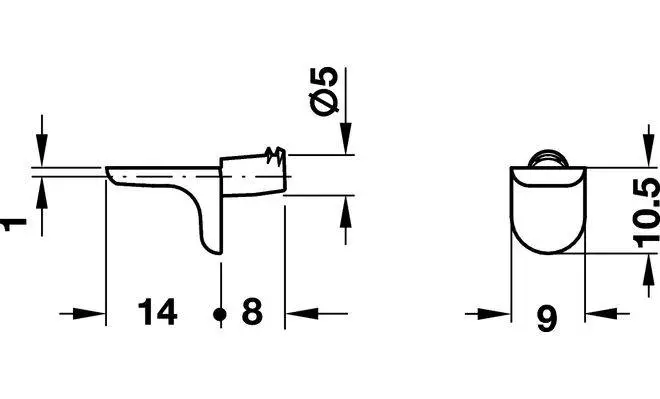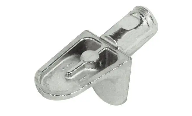 Полицетримач для дерев'яних полиць, матеріал: цинкове лиття, нікельований, з двома клиновими носиками, для свердлового отвору діаметром 5 мм, максимальне навантаження 125 кг.