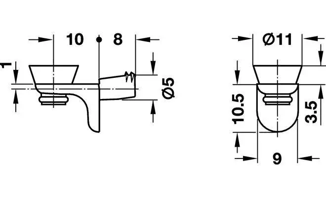 Полицетримач для скляних полиць, з широкою опорою, матеріал: цинкове лиття з пластиковою опорою, нікельований, з двома клиновими носиками, для свердлового отвору діаметром 5 мм.